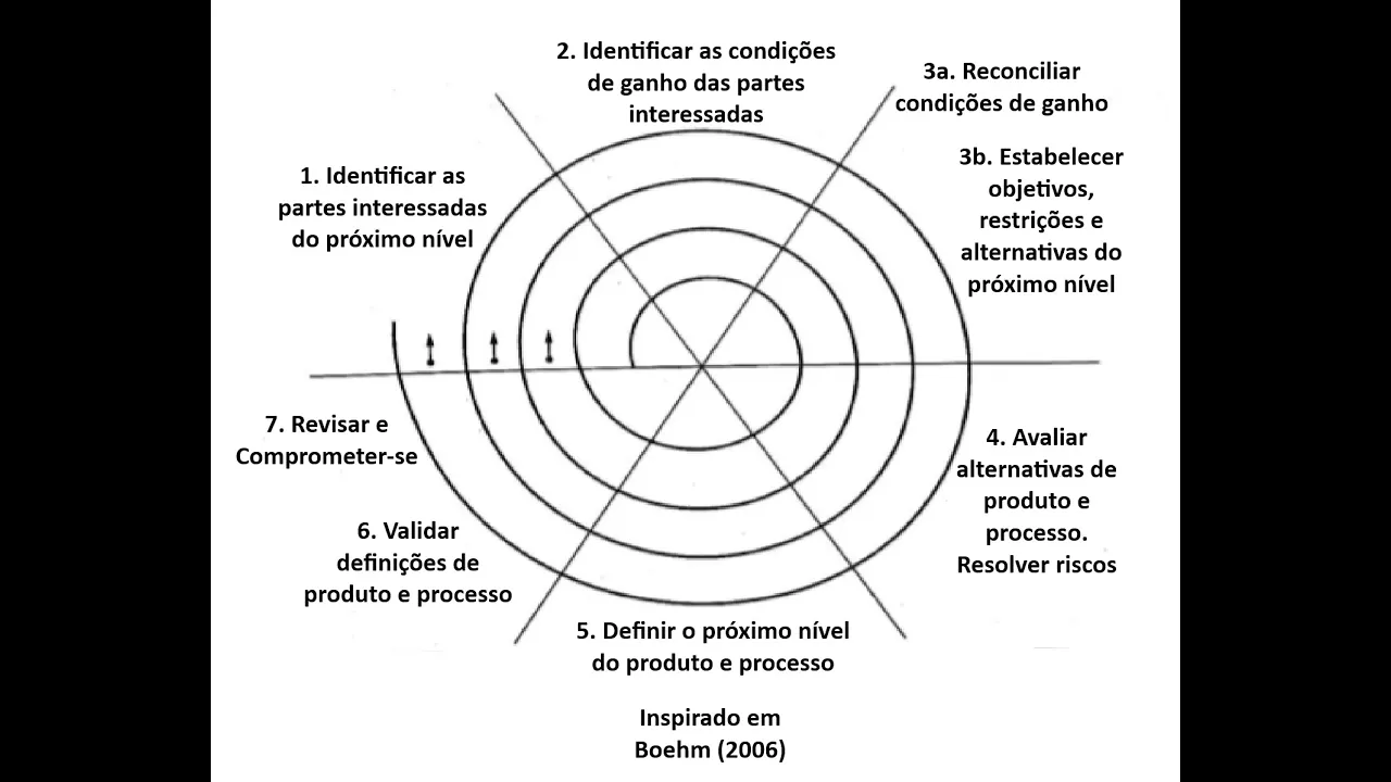 a primeira atividade é colocada Logo no início do ciclo onde são identificadas as partes interessadas do próximo nível o próximo nível pode ser o primeiro nível próximo nível ou próximo ciclo obviamente depois se identificam as condições de ganho das partes interessadas e depois se rec cons siriam as condições de ganho Quando existirem conflitos e aí depois se inicia o ciclo de desenvolvimento espiral propriamente dito onde se estabelece objetivos restrições e alternativas para o próximo nível se avaliam alternativas de produtos e processos se resolvem riscos se define o próximo nível do produto e processo e se