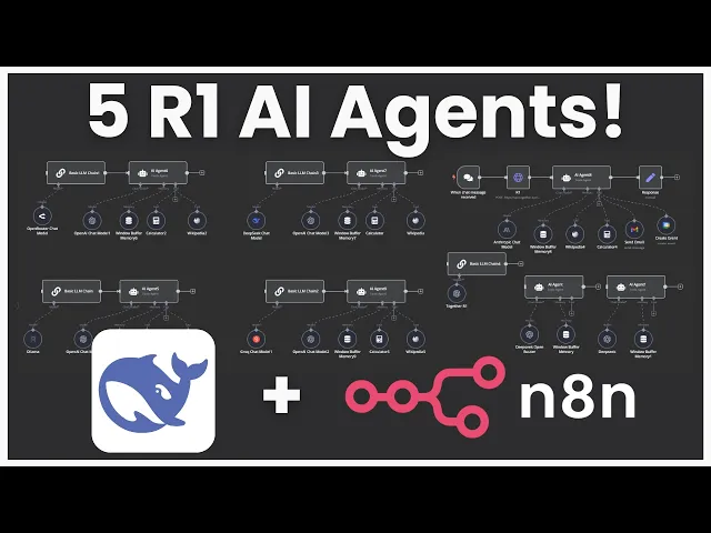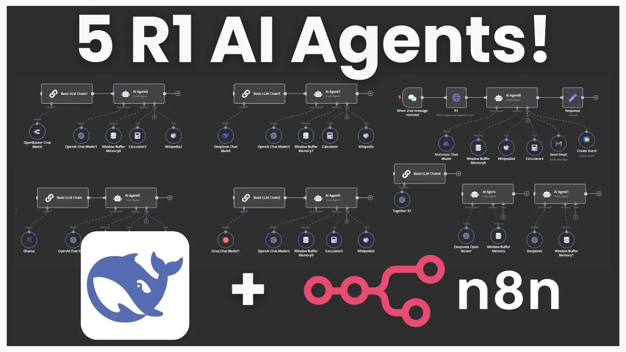 what's going on guys Josh pokok here now on this channel we've covered deep Seek many different times deep seek V3 deep seek R1 and I'm sure loads of you guys have been seeing tons of people talk about deep seek and maybe show you a few different ways how to actually use it I've been getting a lot of different questions of people asking me hey Josh what is the most practical way to use deep seek to start building AI agents and as many of you guys know one of my favorite ways to build AI agents is through a no code platform called N8 n now don't get me wrong I love building AI agents in raw code as well but a lot of the time you really don't need all that and nadn is in my opinion the best no code AI automation tool because not only does it have the most advanced features and is very developer friendly but it is also open source and you can self-host it on your own server and they even just got a new deep seek chat model node as well as an open router node so you can easily integrate these models into your n AI agents now in today's video I'm going to go over five different ways you can use deep seek R1 within NN I'm going to show you the basics on how you can start using deep seek R1 in your AI agent workflows within n8n and then of course you can build upon this and start customizing it for your specific use case you'll also be able to grab the raw Json absolutely for free and import it over into your nadn instance as well so you can get a good head start on implementing deep seek to today so without Ado let's Dive Right In all right guys so like I mentioned I've covered deep seek before on this channel as well as NN many different times so I want to quickly start off by the old method on how to use deep seek within nadm and I'm just going to briefly touch over this because I just want to give you a sense if you don't already know what the new update Ina so before you would actually have to use an open AI node and you would have to basically go add a new connection and in your connection you would have to drop down to add a base URL and you would either have to use open router like so add your open router API key or over here you would have to go over to this one add a uh another same open AI credential right here and change the base URL to deep seeks API and this is still good to know because if you are using maybe some of the other um platforms that I'm going to show you in just a second this can actually be very useful all right so let's start by doing a highle overview of each five of these right here so of course you could count this as six but I'm just going to go over the five new ones so first things first we have open router okay second we have the Deep seek API third we have hosting at locally with AMA fourth we have fast inference time with Gro and then fifth we have different thirdparty providers okay so all right so I'm going to start at number one go in depth on each specific one the pros and cons of each when you may want to use this specific one and how you can actually set each and every one of these up now guys if you want this exact workflow the complete Json so you can just import it over into your naden instance then make sure to join our stride AI Academy Down Below in the description it is currently 100% for free and it's going to have a a lot of behind the scenes resources templates tools trainings Etc that isn't on YouTube here so make sure to join while it is still free it may not be in the future so with the open router flow what we're doing here is we're using a basic llm chain so if you go over here you click on Advanced AI you can see basic llm chain now you could just use another AI agent tool it really doesn't matter I just use basic llm chain because that node right here as you see it doesn't have memory or tooling because if you don't already know deep seek R1 unfortunately at the moment does not have tool calling capabilities so how are we actually going to use this in our AI agents well the beauty behind deep seek R1 is it is really good at thinking so we can actually feed that chain of thought into our actual execution agent so this is like the planner agent that will plan the specific task or question that you're asking it and then this will be the execution agent or the agent that actually has access to different tool calling I hope that makes sense also too guys if you're new to n8n I'd recommend checking out my 49 minute video it's an in-depth n8n course with a 79 page document that you can download for free that will get you set up with nadn I also show you how to self-host it on kifi so you can literally have a powerful AI agent Foundation 100% for free okay so with the open router model of course we are using the open router node right here for our model so you just go to open router you add that router right there and then you're going to click on create new credential you're just going to add in your API key very very simple you don't have to do the base URL anymore and then you can actually just select this drop down menu and select any model you want so if we type in R1 right here you'll see that there are the distilled versions there's the normal version and then there's even the free version now the free version will be a little bit slower but if you do really just want something that's 100% for free you could go ahead try this out I'm going to go ahead use the normal version for now all right and just so you can see this working I'm attaching the chat node right here and we're going to test it out all right so I'm asking at what is there to do for fun in Toronto as you can see our basic llm chat right here is querying our one and it is now thinking now unfortunately we don't get to see the streamed response of the thinking right here but we will get to see it when it is actually done okay sometimes deep seek will take very very long or it will get stuck in a loop so that is just one warning right now so I'm actually going to try this ag