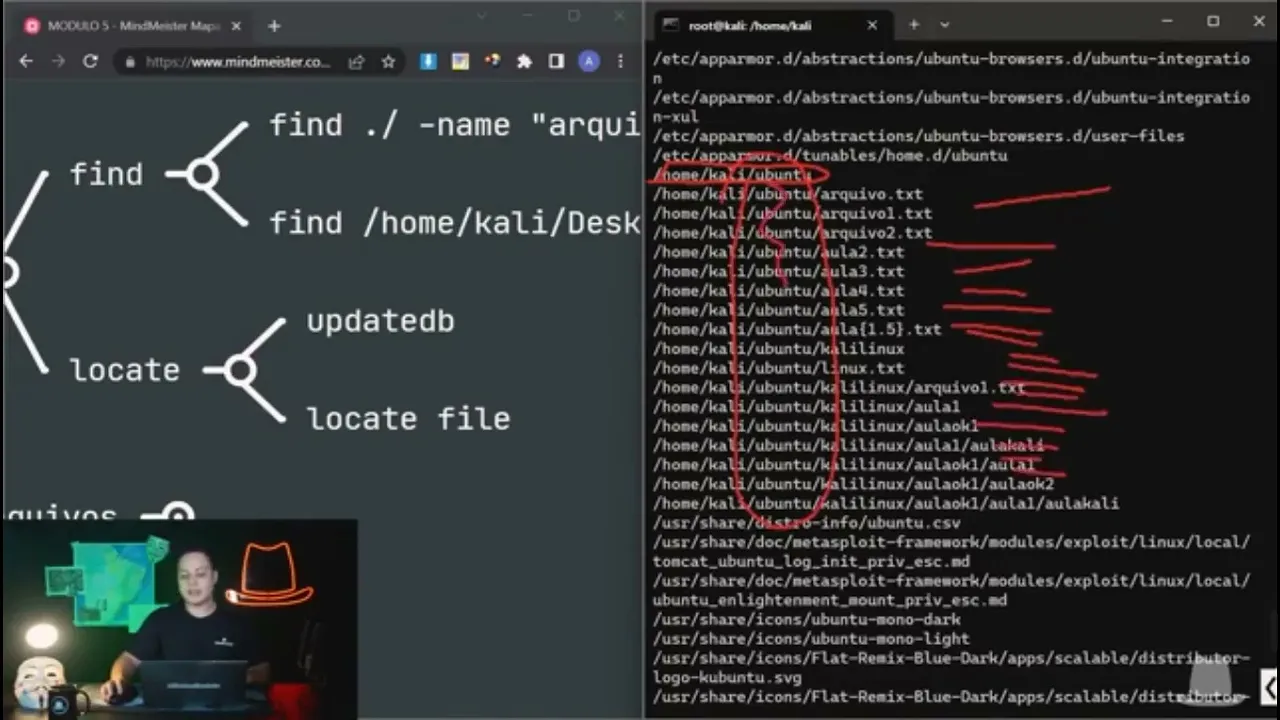 fala pessoal Antônio aqui sejam bem-vindos a mais uma aula e nessa aula aqui nós vamos aprender a buscas no sistema nós vamos aprender como você consegue encontrar arquivos Como você consegue identificar Onde estão algumas pastas juntamente com alguns comandos muito utilizados no Linux tá é muito comum que você precise encontrar algum tipo de arquivo onde que ele tá vamos aprender isso aqui na prática bora pra minha tela e vamos fazer isso juntos então aqui na minha tela eu já tenho do lado meu direito aqui o cali Linux tá e do meu lado esquerdo aqui o que nós vamos aí se baseando conforme for passando as aulas então aqui eu já estou dentro do meu cali tá a gente já aprendeu o comando LS para listar os arquivos eu tenho alguns arquivos aqui listados para que eu possa realizar buscas no sistema e é muito importante isso tá porque por exemplo em todo o sistema a gente tem Por exemplo essa lupinha aqui ó mas aqui eu tô na interface gráfica então eu posso digitar aqui é muito simples né eu clico na lupa e eu posso vir aqui e digitar ving e aí ele já me aparece o vídeo ele agora tá integrado né então a gente tem até uma pesquisa na web se eu quiser realizar pesquisas na web e tudo mais o próprio Windows ele nos permite deixa realizar esse tipo de pesquisa é importante dizer também que o próprio cali ele também tem uma uma busca aqui ó se você vier no cali Linux aqui em cima Você tem uma busca através da interface gráfica então eu quero nmap E aí ele já me mostra aqui ó nmap eu quero o Wi Fight aqu ele mostra Então isso é bem legal mas e se eu quisesse buscar o arquivo se eu procurar aqui um arquivo chamado Ubunto ó a pasta Ubunto ele já não encontrou e a gente tem uma pasta Ubunto que a gente criou ela aqui ó basta o bunto e aqu ele já não encontrou e como é que eu faria então para identificar linha de comando também que eu possa ali através da linha de comando achar algum arquivo achar o próprio nmap Então vamos aprender a fazer isso a gente tem alguns comandos tá o primeiro que a gente consegue encontrar arquivos eu utilizo direto tá principalmente com datas e a gente vai ver aqui ó a gente tem o find o find ele nada mais é do que encontrar né traduzindo aí e a gente por exemplo pode jogar o find aqui a gente joga o caminho ou a pasta onde a gente quer procurar menos name que eu quero o nome daquele arquivo né e e aqui o arquivo então se eu jogar aqui por exemplo find aqui ó ele já tá de ele já nos dá até um caminho completo então se eu vier aqui ó find home cali e eu quero procurar menos name Eu quero procurar dentro da pasta cali Ubunto ou ok. TXT esse arquivo que vi aqui ó ok. TXT olha só ele já encontrou Então é porque aqui aí você fala ah mas tá fácil você listou e ele apareceu e ele tá aqui então você sabe onde ele tá sim aqui tá tranquilo porque eu tenho poucos arquivos Ó mas imagina que eu tivesse 1000 2.