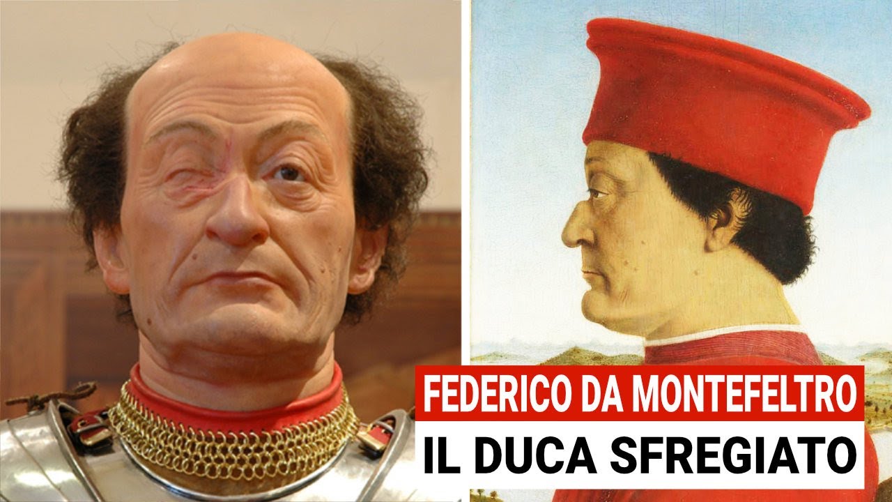 rinascimentale sono il colore la luce espressione di divina luminosità le caratteristiche che più si prestano alla lettura allegorica degli esegeti biblici da isidoro di siviglia a rabano mauro fino a ugo di san vittore [Musica] il ritratto di federico è invece più naturalistico [Musica] la sua figura e possente incorniciata dal forte rosso della veste della berretta che isola il profilo mentre lispida calotta dei capelli accento gli effetti di massa volumetrica i capelli sono irsuti lo sguardo fiero e lontano il naso adunco è rotto era una cicatrice ottenuta durante un torneo in cui aveva perduto anche l'occhio