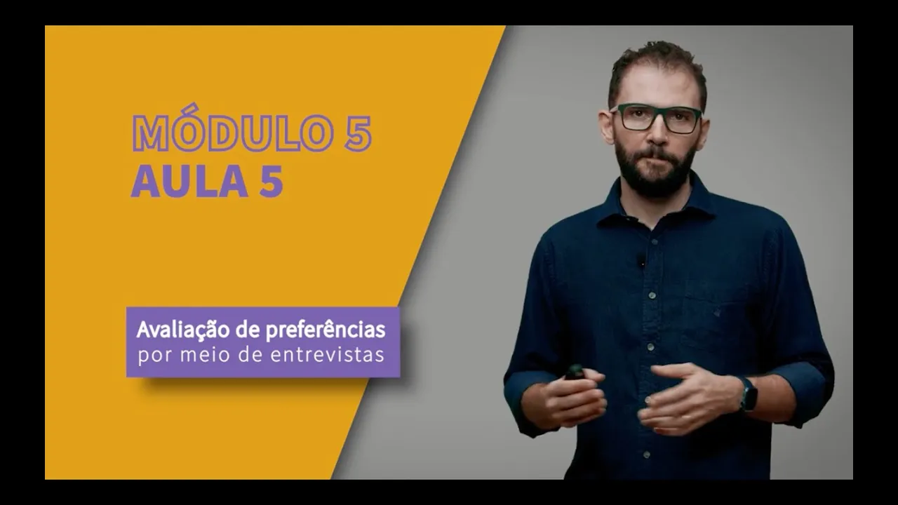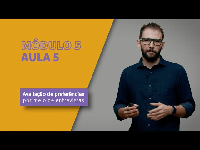 Módulo 5 Aula 5 Quando nós fazemos avaliação de preferência por meio de entrevistas, nós podemos então entrevistar a própria pessoa, o próprio cliente, desde que ele tenha habilidades de comunicação suficientes para entender as nossas perguntas e responder a essas perguntas. Ao fazer uma entrevista, às vezes a gente pode fazer perguntas abertas, como o que você gosta de fazer no seu tempo livre, quais são algumas comidas que você gosta, que tipo de música você mais gosta. Nós podemos fazer perguntas com escolha, que envolvam algumas opções, por exemplo, pelo que você se esforçaria mais?