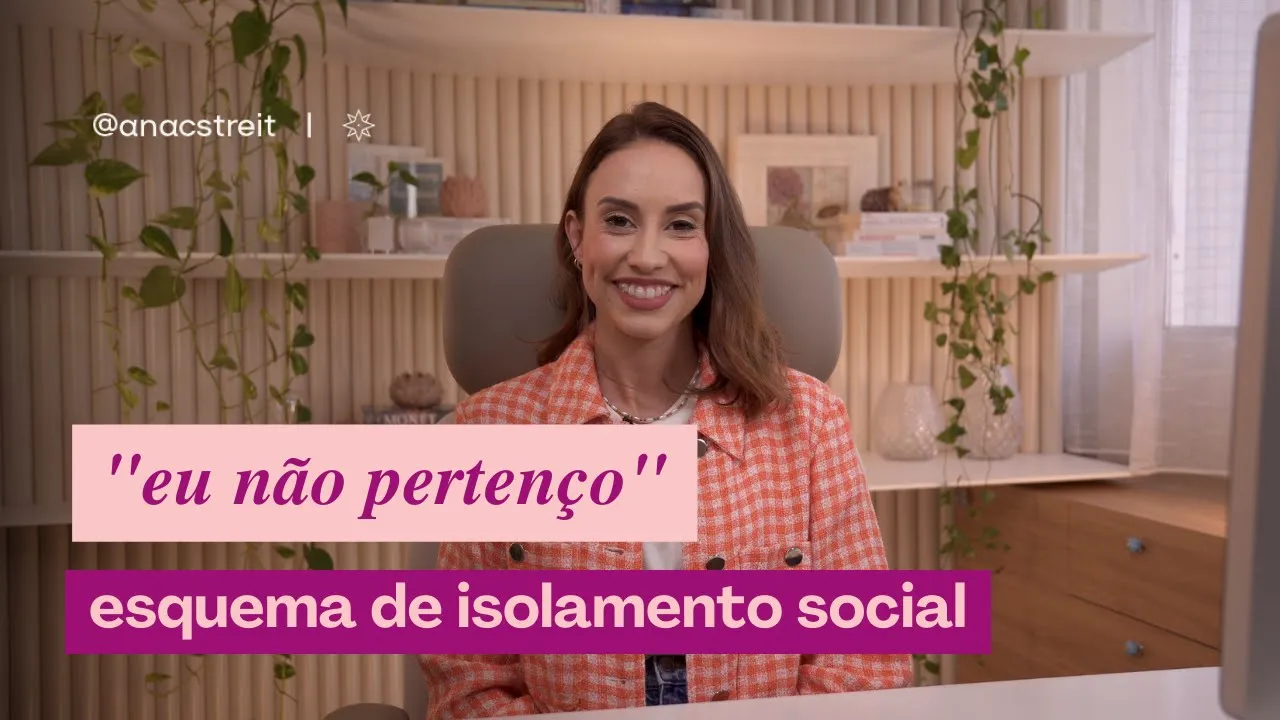 sobre psicologia sobre conexões saudáveis e sobre formas mais funcionais da gente lidar com desafios da vida no vídeo de hoje a gente vai conhecer o esquema de isolamento social a grande dificuldade do esquema de isolamento social é a sensação de não estar pertencendo a nenhum grupo é a falta de pertencimento é aquela pessoa que se sente desconectada das outras é o primeiro vídeo do canal eu te convido a assistir os outros vídeos que a gente tem aqui sobre esquemas que vão te dar aí um Panorama sobre o que é esquema sobre a terapia do esquema