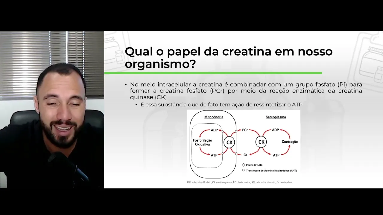 Olá tudo bem seja muito bem-vindo aqui a mais uma aula seja muito bem-vinda a mais uma aula nessa aula nós iremos falar um pouco sobre a creatina um suplemento que ainda gera polêmicas né Depois de milhares e milhares de artigos produzidos publicados sobre a creatina um suplemento mais seguro que existe ainda tem gente que tem medo receio de utilizar esse suplemento Tá certo creatina é um suplemento que apresenta inúmeros benefícios para a hipertrofia muscular e a gente vai discutir aqui nessa aula mostrar para você como utilizar Quando e por quanto tempo vamos lá creatina ela é um membro da família dos fosfagênio da guanidina é um composto também chamado composto guanidino é produzido a partir de aminoácidos né e é de ocorrência natural então Cadina não é uma substância sintética o seu corpo produz Tá certo apesar de ser feita de forma sintética ela não é extraída de animais o suplemento mas o nosso corpo produz creatina a partir de da arginina o aminoácido arginina juntamente com a glicina a arginina é combinada com a glicina formando ornina e ácido guanidino acético ou guanidino acetato depois esse ácido guanidino acético ele é metilado pela cenos metionina a a a Sam né a Sam tem a metionina em sua estrutura a metilação consiste basicamente em adicionar o grupo metil grupo metil é esse daqui ó ch3 um carbono e três hidrogênios então a Sam metila o ácido guanidino acético formando a creatina ela é produzida no fígado e nos rins Tá certo em Reação Em conjunto produzida no fígado ácido Gino acético depois finalizada lá nos zins e essa creatina depois de produzida ela segue para o seu músculo lá no músculo ela é fosforilada com gasto de ATP tá vendo creatina ATP doa um fosfato doua um fosfato formando a fosfocreatina E aí é essa fosfocreatina que é utilizada para gerar trabalho a gente vai entender o que que acontece aqui a gente tem né eu até falei o contrário a arginina é combinada com a glicina formando ácido guanidino acético no rim né eu falei no fígado depois ela finalizada no rim não ela é produzida inicialmente no fígado no rim depois ela segue para o fígado no fígado ela é metilada tá vendo aqui a gente tem a sintetizada no fígado rins e pâncreas arginina combinada com a glicina no fígado depois o ácido guanidino acético é metilado no e a arginina é combinada com glicina no rim depois o ácido gonino acético é metilado no fígado formando a creatina aí essa creatina ela segue para o músculo lá no músculo ela é convertida em fosfocreatina quem age diretamente quem de fato tem efeito é a fosfocreatina a creatina só age através da fosfocreatina Então ela pura não tem efeito sobre a geração de energia ela precisa ser fosforilada para agir Tá certo a gente sintetiza creatina e na nossa alimentação a gente consegue ingerir aproximadamente 1 g de creatina por dia né Eh então Considerando o indivíduo que não é ativo a gente consegue na alimentação né natural sendo onívoro comendo de tudo eh obter a creatina que a gente precisa para as nossas funções corporais certo a ingestão de creatina olha só que interessante a ingestão de creatina exerce uma função no controle da sua síntese através de um mecanismo de retroalimentação negativa o feedback Ou seja quando você consome muita creatina o seu corpo para de produzir ou diminuir a produção ah Professor Então quer dizer que a suplementação diminui a produção endógena sim quando você suplementa 5 g de creatina por dia a sua síntese de creatina cai se você já tem a creatina que você precisa não faz sentido seu corpo produzir Professor isso não pode dar problema meu corpo não pode parar de produzir creatina e quando eu ficar sem suplementar isso fazer prejudicial não não não a creatina ela é sintetizada por enzimas ó a h e a Sam quando você para de consumir creatina essas enzimas são expressas novamente e passa a sintetizar novamente creatina não é sintetizada por glândulas eu sei que você tá fazendo analogia lá com a testosterona Ah porque quando a gente usa testosterona a gente para de produzir e aí o nosso testículo as nossas gônadas atrofiam isso vale PR glândula mas não vale para enzimas Tá certo uma vez que você tem creatina as enzimas né a gade principalmente tem a sua expressão diminuída a expressão da enzima é diminuída é reduzida porque não tem mais tanta necessidade ela est realizando essa ação uma vez que a creatina cai essa enzima ela é expressa ver se você interrompe a suplementação a enzima expressa e ela volta a produzir normalmente então não tem nenhum tipo de problema associado a esse controle de feedback negativo Tá certo pode ficar tranquilo Qual o papel da creatina no meu corpo é basicamente funcionar como uma pilha ela vai te dar energia mas não é ó a gente muita gente confunde energia de ATP com energia de estímulo ah a cafeína me dá energia a cafeína é uma substância psicoativa ela é um estimulante energia é energia de ATP para gerar trabalho a energia que a creatina dá não é estímulo você não vai ficar estimulado na academia não ela vai melhorar a capacidade da sua musculatura de contrair e gerar trabalho é isso que a creatina faz Tá certo ela melhora a capacidade de ressintetizar ATP o que que acontece o nosso organismo extrai a energia dos carboidratos proteínas e lipídios né através de processos de oxidação nas nossas mitocôndrias ciclo de crebs beta oxidação cadeia transportadora de elétrons a gente produz ATP para gerar trabalho seja trabalho mecânico de contração muscular trabalho químico ou trabalho de transporte nosso corpo oxida os nutrientes queima o nutriente para gerar ATP a creatina também é uma forma Alternativa de ressintetizar TP o que que acontece quando você suplementa ou quando o seu corpo produz creatina essa creatina chega no seu músculo vamos lá aqui eu tenho sarcoplasma sarcoplasma é o