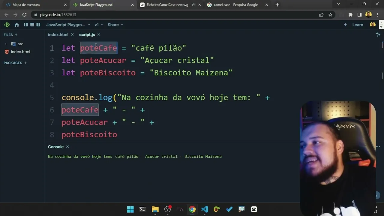 em maiúscula né então ele fica aparecendo uma covinha de um camelo é isso que a gente utiliza ali como padrão ali de boas práticas na hora de dar nome ali para as variáveis então no meu pote de café que que eu vou ter ali Vamos colocar entre aspas a gente vai ter Café Pilão porque porque minha vó ela bebe Café Pilão tá agora a gente precisa fazer o quê A gente precisa criar uma outra variável para aguardar né o açúcar da vovó que Afinal né então vamos lá então let então eu poderia colocar aqui ó