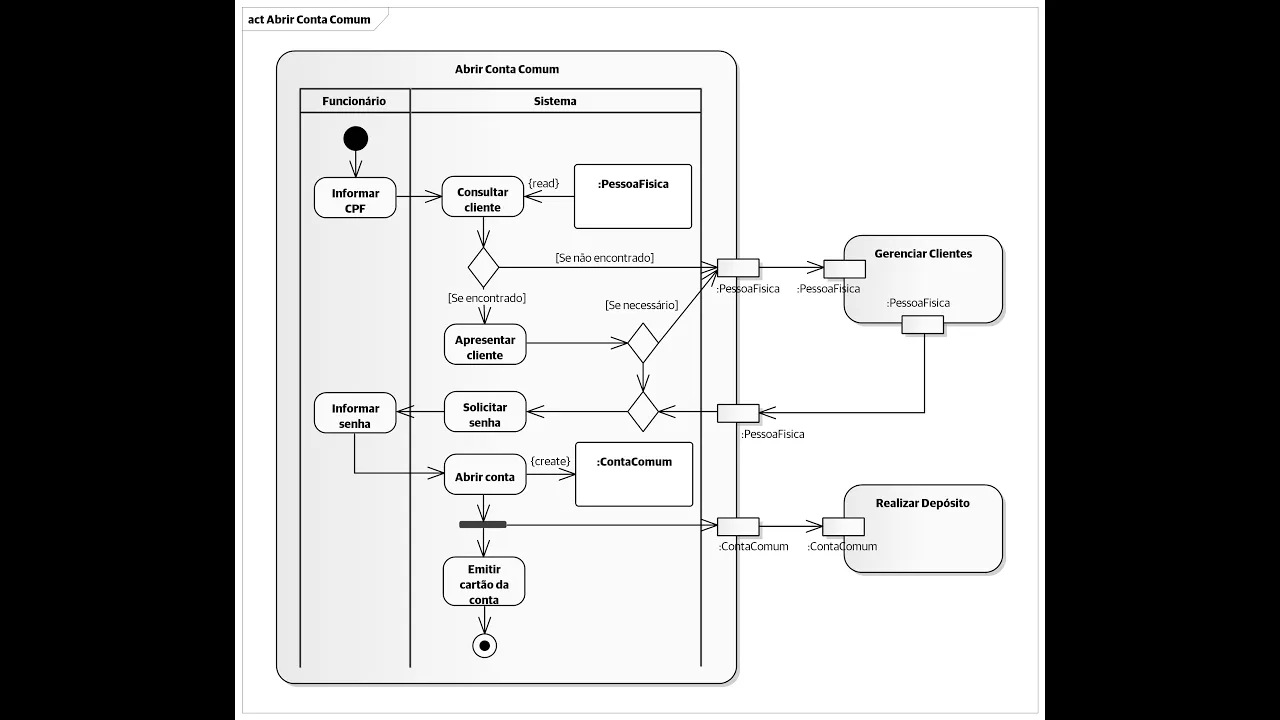 parâmetros de atividades recebe o objeto pessoa física criado então Eh o fluxo é Unido Pelo nó de união Ah o fluxo havia sido eh se havia S dividido anteriormente por esse nó decisão ele é reunificada E aí se passa a ação Solicitar senha o fluxo volta ao funcionário o funcionário Informa a senha fornecida pelo cliente e aí o fluxo volta a a a raia do sistema a para executar ação Abrir conta e isso gera um novo objeto da classe conta comum comoes como representado pelo fluxo de objetos com efeito create criado um novo objeto Ah