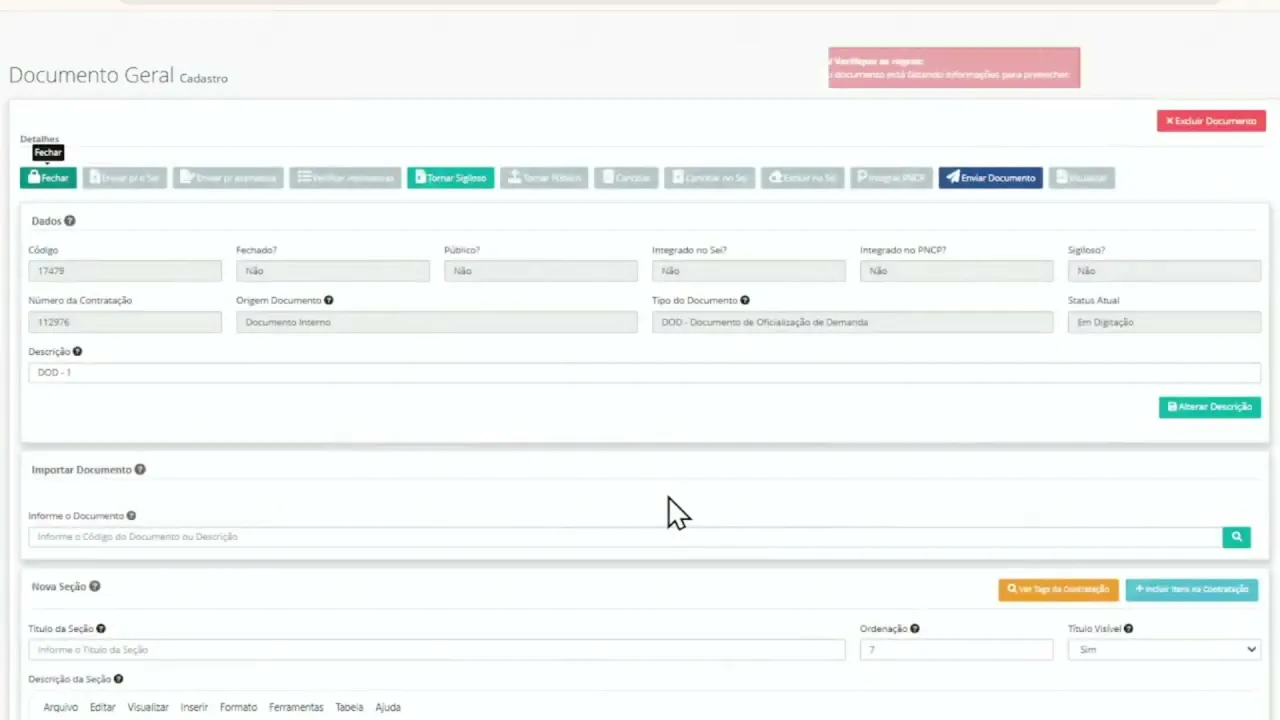 padrão alguns dos documentos padrão vão conter informações de sessões obrigatórias a serem preenchidas que são aqui ó por exemplo nesse documento meu aqui eu tenho aqui nessa sessão 003 aqui ó esses três pontinhos de interrogação onde tem esses três pontinhos de interrogação o sistema não deixa você fechar sem preencher a sessão quer ver vamos tentar fechar esse documento aqui vou clicar aqui em fechar que que vai acontecer vai aparecer o erro erro verifique as regras Vamos ler lá no vermelhinho ó Leia lá gente Leia sempre o que tá escrito no vermelhinho pelo amor de Deus