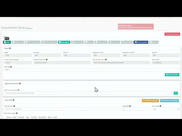 a partir do momento que o documento tá fechado eu não consigo editar o documento eu tenho aqui um dod esse dod meu está aberto e eu consigo vir aqui ó clicar em editar o documento tô editando numa nova tela e eu consigo vir e editar cada uma das sessões também quando o documento tá aberto é possível excluir o documento para para assinar o documento no sistema sei eu preciso fechar o documento e depois enviar para o se mas eu quero mostrar um detalhe para você que pode acontecer nos seus documentos gente em todos os documentos