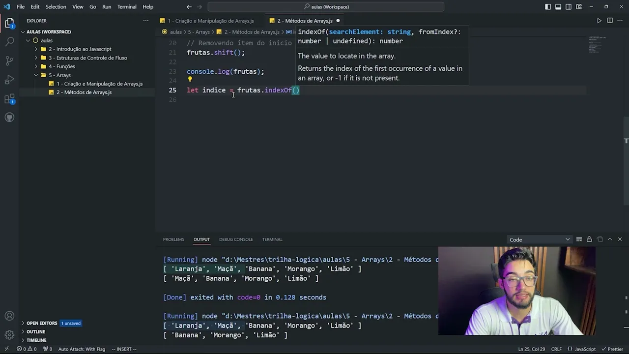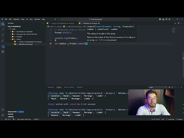 eh para manipular o início e o final do Array é muito é muito mais prático do que usar os outros métodos que nós iremos ver aqui depois depois de a gente vai ver outros métodos aí que eles dão mais flexibilidade mas e tem uma notação um pouco diferente tá então com esses visto né visto esses dois métodos que adiciona no final e adiciona e remove do final e do início nós temos aqui também um método que ele é interessante que é pra gente descobrir o índice de algum elemento então no caso aqui eu tenho a