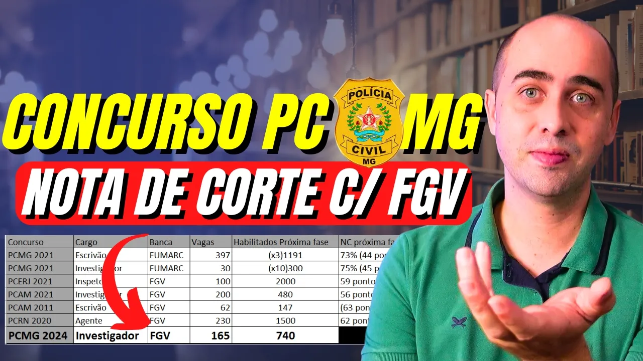 qual vai ser a nota de corte da Polícia Civil de Minas Gerais eu tenho uma análise aqui que eu atualizei e vamos mostrar para vocês agora fala concurseiro meu nome é Guilherme Guimarães Eu sou especialista em concursos e vem aí a prova da Polícia Civil de Minas Gerais com a banca FGV né a temida FGV e eu fiz uma análise já tinha feito ess análise já tinha mostrado para vocês mas eu dei umas atualizadas nessa análise coloquei aí dentro dessa nova nota e Quero mostrar para vocês para vocês já pensarem sobre a nota de corte claro que a nota de corte ela é Ela deve ser pensada a partir da dificuldade da prova né então às vezes a prova é muito difícil nota de corte tende a abaixar e a prova muito fácil ao contrário mas mesmo assim eu acredito que a gente pode ter uma previsão da nota de corte né Por exemplo os concursos policiais eles tem uma previsão ali na casa dos 70% e eu quero fazer esse exercício com você eu troue várias análises aqui de várias provas e já deixa a tua curtida porque essa análise só vai ver aqui então se você quer ter acesso aí à análises em primeira mão Você curte o vídeo se inscreve porque daí o YouTube entende que você acha esse conteúdo relevante e você vai receber antes do pessoal e considera também ter o projeto caveira veja você que tá estudando poliv de Minas Gerais você vai ter um bom tempo para estudar né eles deram uma possibilidade bacana no pós digital e aqui eu tô na plataforma do projeto caveira ó já tem aqui a turma pós digital da Polícia Civil de Minas Gerais tá até o final do mês aí vai sair o simulado já os simulados do projeto caveira você vai poder depois comparar cada matéria se quiser comparar com com a concorrência você pode comparar até cada questão percentual de cada questão mas daí não para por aí você tem além dos simulados os flashcards que é uma ferramenta para você memorizar você tem questões questões só policiais Então você vai poder filtrar muito mais fácil né com questões só policiais Você tem os resumos interativos para aquela hora de você dar aquela revisada também para você conseguir ter um material mais enxuto você tem guia caveira com mentoria você tem um painel tático o painel tático aqui ele resume tudo isso daqui então você vai ver tem o resultado Nas questões no flashcards pessoal é muita coisa em uma plataforma só e com certeza você vai est na frente da tua concorrência e levando tudo isso agora você ainda tem brindes exclusivos e colocando volts lá você vai ter um desconto e te espero lá no projeto caveira Então vamos pra análise aqui o que que eu coloquei na análise eu coloquei aqui o resultado da do último concurso que foi fumar né Nós tínhamos ali 397 vagas para escrivão e 30 para investigador eu coloquei aqui os habilitados pra próxima fase Então as a quantidade de pessoas que ir pra próxima fase e na minha humilde opinião de concurseiro você tem que estar se preocupando em passar pra próxima fase né porque você indo até o final do concurso você tem grandes chances de ser chamado no último concurso todo mundo foi chamado né investigador todo mundo foi chamado talvez escrivão falta algum alguém ainda mas a perspectiva é todo mundo chamar Minas Gerais chama demora né chamam aos poucos mas eles chamam Então você tem que passar pra última fase e aqui para você entender um pouco ó no último concurso foi fumar e passava ali três vezes pra próxima fase e 10 vezes na em escrivão e e claro que a gente não pode levar a fumar como referência a gente precisava levar FGV então o que que eu fiz tentei pegar concursos parecidos da FGV que sejam na área policial então assim e que fossem cargos semelhantes até tinha por exemplo Policia é psicólogo lá em Santa Catarina só que daí não é um cargo semelhante você não pode pegar assim um cargo que sai muito pouco como psicólogo e comparar então peguei cargo semelhantes peguei por exemplo aqui ó a polícia civil do Rio de Janeiro que teve prova em 2021 nós tínhamos 2. 000 pessoas habilitadas na próxima fase tá 2. 000 pessoas e foi 59 pontos de 100 para você ter a nota de corte e tinha 55.