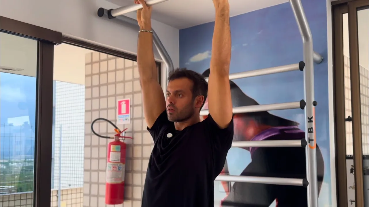 cintura pélvica que é a base de tudo vou pra cintura escapular aqui que que é legal fazer a pendurada né você já sabem na importância pendurada ela ajuda a remodelar o corpo o nosso ombro ele não foi feito para ficar o dia inteiro em flexão ele tem que entrar nessa posição de vez em quando ISO que abriu muito o meu peito cara ajudou demais e aí depois a pendurada passiva que é essa aqui que eu tô só relaxando Deixa o Corpo derreter descomprimir a coluna tudo você pode ativar a escápula fazer a pendurada ativa eu