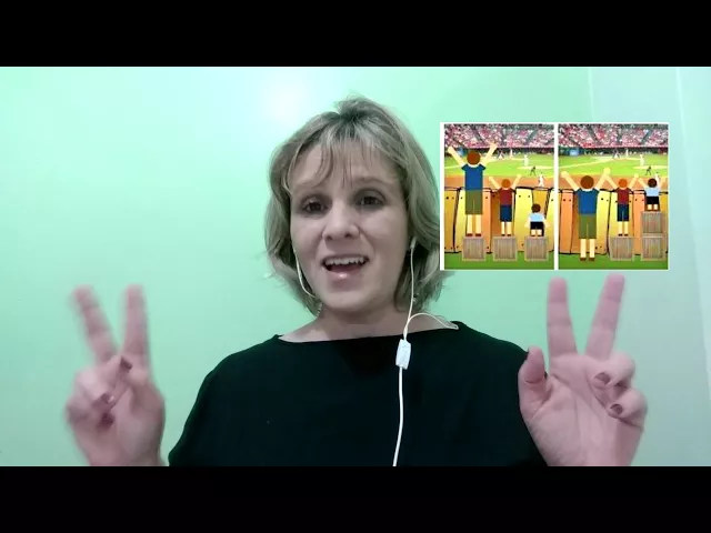 Eles estão recebendo as mesmas condições, os mesmos equipamentos para acessar esse jogo. Mas, as diferenças individuais façam com que eles não tenham equidade, que eles não tenham igualdade no acesso porque, a figura do menino mais baixo que está com um caixote só, ele não acessa o jogo, ele não consegue ver o jogo. Na figura ao lado você traz o menino baixinho em cima de dois caixotes, e a linha da visão dele passa da cerca que tava impedindo, o menino do meio, que é uma estatura mediana em cima de um caixote e a visão do jogo também ta ok e essa pessoa que é mais alta e não precisa de caixote nenhum.