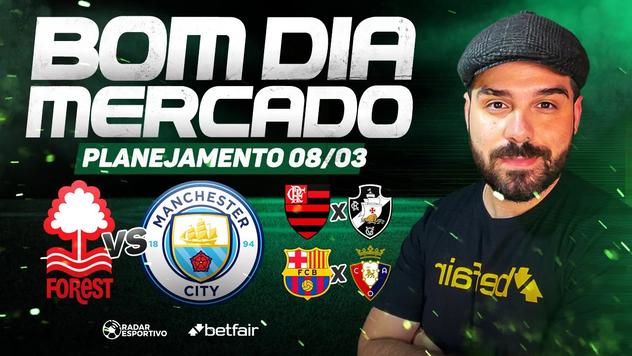 Olá meus amigos estamos começando mais um planejamento de trabalho para esse sábado dia 8 de Março com muitos jogos Talvez algumas oportunidades e claro diversas pegadinhas que a gente vai tentar esquivar ao longo do caminho Vamos começar com City e Forest ainda na Inglaterra temos o Liverpool Líder isolado contra o lanterna southampton temos na Espanha o Barcelona enfrentando o sassha Barcelona também protegendo ali A sua liderança em Portugal o Benfica que perdeu pro Barcelona no primeiro jogo da Champions enfrenta o Nacional de olho tanto no jogo da volta do Benfica quanto em não deixar a