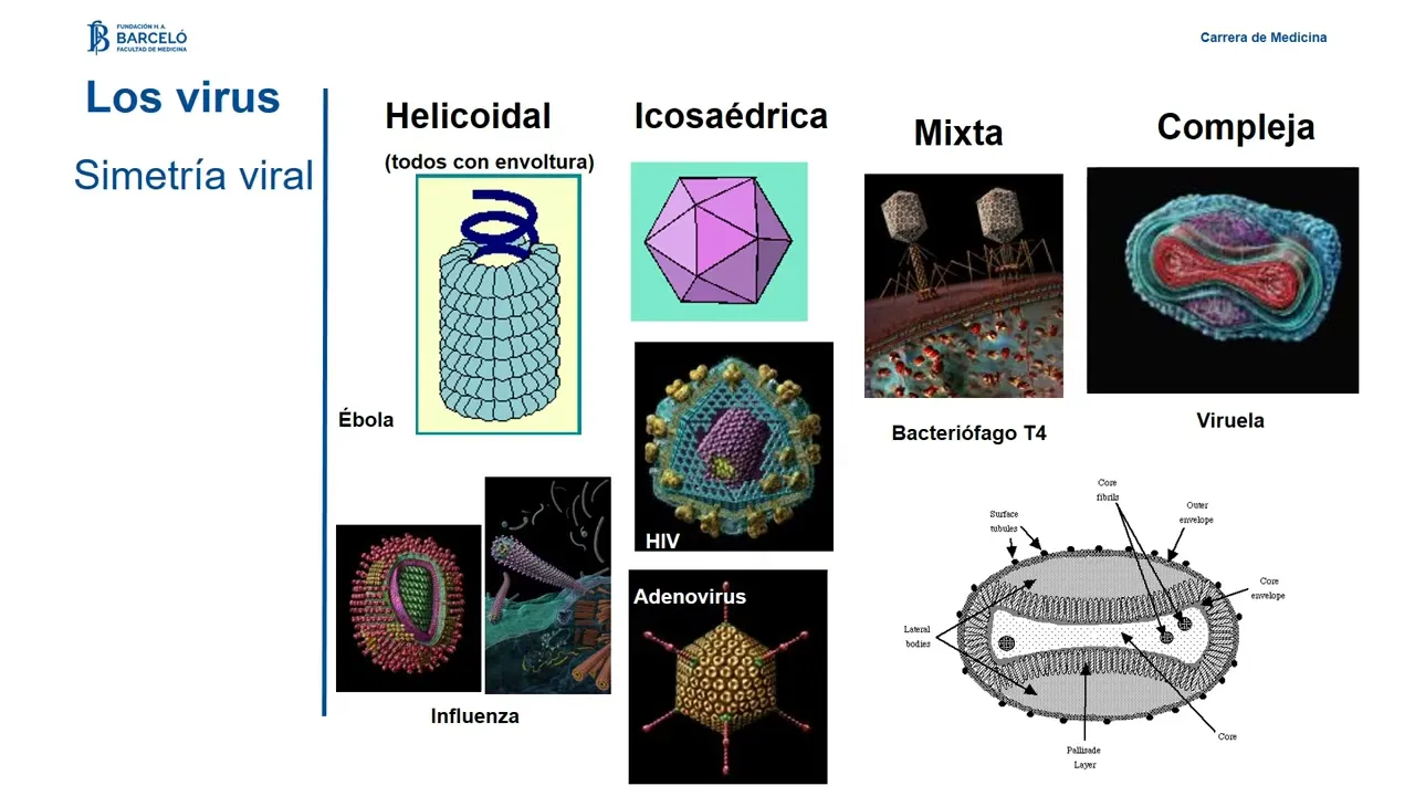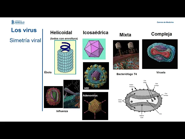 en general tienen un una estructura de tipo helicoidal virus Ébola por ejemplo otros icosaédrica como el HB como adenovirus lo bacteriofagos son los virus que van a Entonces infectar por lo tanto células y algunas estructuras son complejas como el virus de la viruela por otro lado del ácido nucleico puede ser de unidad única especie ADN o ARN mono o bicatenario es decir que tenga una hebra o dos y algunos son Por otra parte la mayoría de los virus ADN suelen ser bicatenarios excepto los parvovirus lineal o circular lineal pueden circulizarse circular les brinda protección replicación