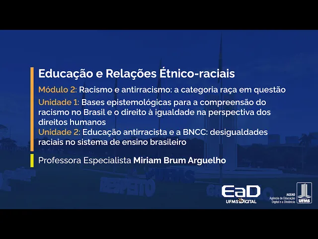 [Música] Olá seja bem-vindo bem-vinda a nossa disciplina educação e relações étnico-raciais eu sou a Professora Miriam coelho e trabalho essa disciplina junto com vocês hoje abordando o módulo 2 racismo e antirracismo a categoria raça em questão o nosso objetivo de aprendizagem nesse módulo é de estudar as bases epistemológicas para compreensão do racismo no Brasil destacando o papel da educação bom então nós organizamos o nosso material de estudo em duas unidades dentro desse módulo a primeira delas é intitulada base epistemológicas para compreensão do racismo no Brasil e o direito à igualdade na Perspectiva dos direitos humanos