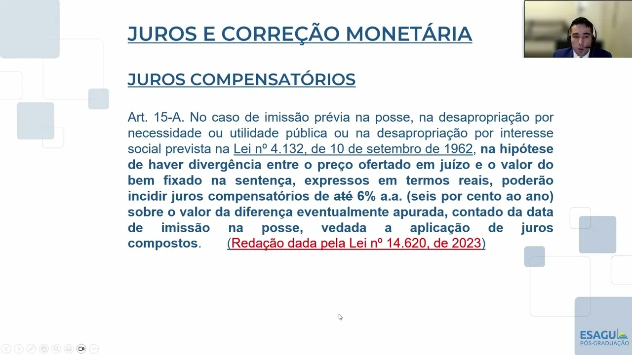 000 vai dar 7200 ao ano invés dos 6. 000 que incidiria sobre a redação eh eh redação do Decreto Lei né a redação expressa do do do Decreto Lei Então veja bem a base de cálculo passa a ser a diferença entre o valor do bem definido em sentença e e 80% do valor depositado em juízo que é aquilo que que o particular pôde levantar tá bom Aqui senhores só trouxe a redação do 15 a no final é a mesma que a gente acabou de ver com a com as redações estipuladas aí pelas pelas medidas Provisórias mas só para citar para vocês porque às vezes vocês vão se deparar com isso a lei 14620 2023 que trata basicamente do Minha Casa Minha Vida né Eh acabou trazendo temas de outras leis aí por emendas parlamentares e ela alterou uma série de dispositivos no Decreto Lei 3365 e uma delas foi ela repetiu o 15 a mas agora por lei tá bom não é mais fixado por Medida Provisória a redação atual hoje do 15 a então que é a mesma que a gente já conhece ela é dada pela lei 14620 e não pelas medidas Provisórias senhores que mais que eu quero falar de juros compensatórios que que eu falei para vocês os juros compensatórios visam compensar a perda precoce da Posse então eles vão incidir desde a emissão provisória na posse do poder público o termo Inicial então dos juros compensatórios é a emissão provisória na posse do poder público sem ser dono ele entra naquele bem mas não é dono como forma de pensar o particular que ainda não recebeu o preço integralmente incid em juros compensatórios a partir da emissão provisória na posse e qual que é o termo final senhores como é que o poder público paga em regra precatório não é então na data da expedição do precatório senhores não é n na data do levantamento a gente vai falar mais sobre isso Qual que é o termo final dos juros compensatórios a data da expedição do atório então esses juros vão incidir entre a emissão provisória na posse e a data da expedição do precatório senhores que mais que eu quero trazer para vocês como eu disse paraos senhores e lá na na na atrás quando eu tava tratando ali das da da D 2332 eu disse pros senhores Olha lá quando quando o STF julgou a liminar na de 233 2 em 2001 ele suspendeu os parágrafos primeiro e segundo do artigo 15 a que que esses artigos que que que que esses parágrafos primeiro e segundo diziam os juros compensatórios destinam-se apenas a compensar a perda de renda comprovadamente sofrida pelo proprietário não serão devidos juros compensatórios quando o imóvel possuir graus de utilização de terra e de eficiência na exploração iguais a zero senhores esse Artigo 15 a os parágrafos primeiro seguinte e segundos do 15 a ele veio para limitar os juros compensatórios que que ele disse Olha esses juros compensatórios senhores eles não vão compensar a perda da propriedade eles vão servir para compensar a perda de renda se é que existiu uma perda de renda sofrida P proprietário se ele oferir renda com aquele imóvel sim é justo Que el que ele tenha que ele receba juros compensatórios mas se não houve isso não há Se falar em juros compensatórios e bem por isso se o imóvel tiver um grau de utilização de terra ou de eficiência de exploração iguais a zero não há que se falar em juros compensatórios porque não há renda gerada naquele imóvel não H perda de renda sofrida pelo proprietário que que o STF disse quando ele julgou a liminar ele disse que era inconstitucionais isso aí porque os juros deveriam compensar a perda precoce da propriedade ao contrário do que tava dizendo no decreto lei olha não isso é inconstitucional mas quando o STF foi julgar o mérito da da da dei 2332 lá em 2018 que que ele falou ele falou negativo a gente vai mudar o entendimento aqui também não só o percentual fixo de 6% de de taxa de juros compensatórios é válido mas esses parágrafos primeiro e segundo 15 a também são constitucionais os juros compensatórios vão compensar perda da renda a a privação da Posse desde que haja exploração econômica e desde que seja comprovado nos autos a perda da propriedade é compensada pela indenização pela correção monetária e pelos juros moratórios não pelos juros compensatórios ele mudou o seu entendimento e esses esses parágrafos primeiro e segundo 15 a São constitucionais então fixem Senhores o juros compensatórios vão compensar a perda de renda sofrida pelo proprietário Se não houve perda de renda mesmo com a emissão provisória da Posse não há Se falar em juros compensatórios perfeito pois bem era isso que eu queria trazer sobre os juros compensatórios pessoal se vocês conseguiram entender isso aqui o resto é mamão com açúcar juros compensatórios são o grande vilão das ações de desapropriação a grande dificuldade das ações de desapropriação juros de mora é mamão com a açúcar é mamão com açúcar não há dificuldade em se entender isso aqui perto de tudo que eu acabei de expor senhores eu acabei de explicar para vocês que os juros compensatórios vão compensar a perda de renda não é isso que o STF entendeu a perda de renda precoce do proprietário quando há emissão de posse do poder público no início do processo pelo poder público Então como o proprietário fica todo esse período entre emissão provisória de posse até a Expedição do precatório sem ter sido pago Esse período aí se houve uma perda de renda pelo proprietário na exploração do bem ele tem que ser compensado com juros compensatórios já oos juros de mora não senhores juros de mora eles vão compensar atraso no no pagamento mora é isso mora é atraso no pagamento é é demora no pagamento então o que que diz o 15b do Decreto Lei 3365 nas ações a que se refere o 15 a ou seja nas ações de desapropriação os juros moratórios destinam-se a recompor a perda decorrente do atraso no efetivo pagamento da indenização fixada na decisão final de mérito a partir de