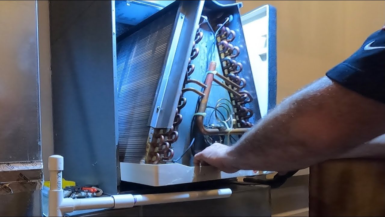 forth across this evaporator clone all these tubes these are called little u-bins or youtubes the original youtube but the refrigerants going back and forth through this evaporative coil the idea is as we're sending all that refrigerant there's a lot of surface area a lot of tubing a lot of that tubing is touching a lot of this aluminum so there's a lot of surface area the second law of thermodynamics the refrigerant is a lower temperature than the air so the heat is going to leave the air and go to the refrigerant since there's a lot of