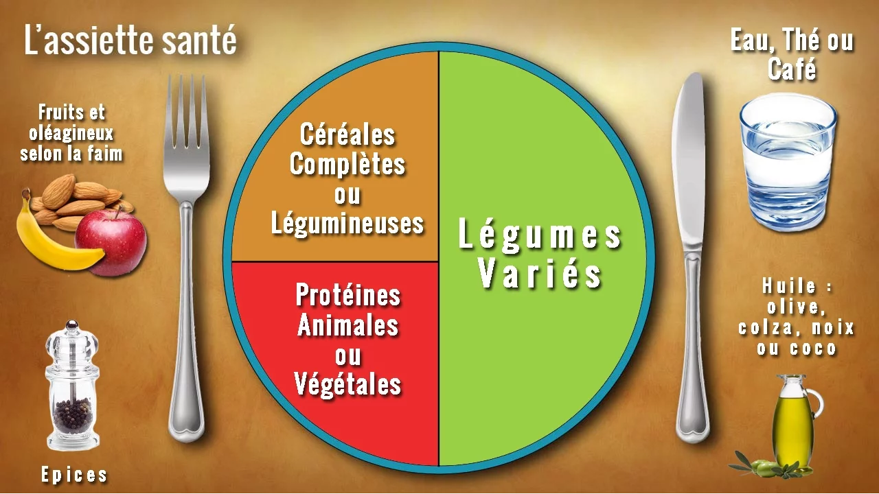 classique et le riz classique faites bien attention aux modes de cuisson respecter scrupuleusement les conseils de cuisson il aurait donc un autre quart à remplir et qu'est ce qu'on va y mettre on va y avait tout simplement les protéines soient animales soient végétales donc ça veut dire quoi vous allez juge jongler entre de la viande blanche du poisson des oeufs et des protéines végétales comme les légumineuses par exemple ce qu'il faut retenir tout simplement c'est que vous avez juste à limiter au maximum votre consommation d'eau rouge et de charcuterie à maximum deux fois par semaine