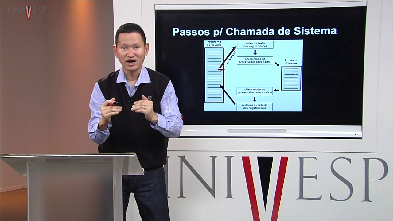 modo Kernel né pro modo de usuário uma vez que agora quem tá manuseando essa Chamada seria o sistema operacional e ess e ela vai fazer o quê Ela vai identificar que que chamada é essa primeiramente como eu falei para vocês então ela vai primeiro manusear segundo ela vai identificar que chamada é que ocorreu e na terceira no terceiro procedimento ela vai executar o procedimento tá a a receita que ela tem que executar para finalmente voltar a executar o sistema tema tá é como como se fosse assim falando uma linguagem bem simples eu tô assando um