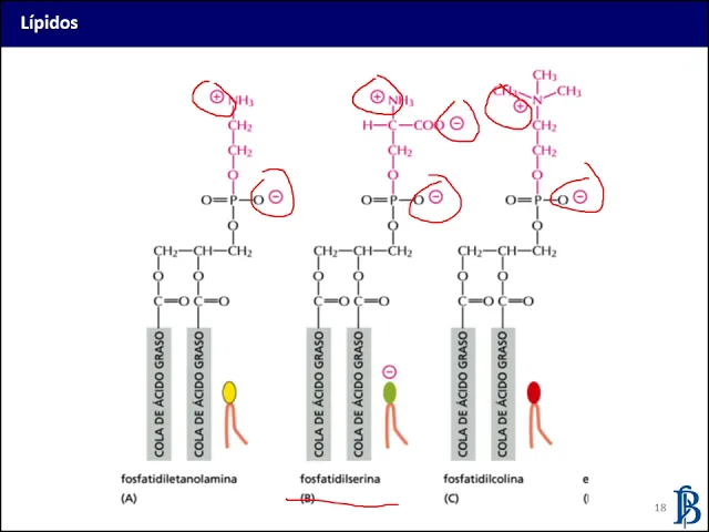 foso limpio resultante es una fosfatidilcolina y si se unen una serina el resultante es una fosfatidilserina si podemos apreciar en este dibujo como dependiendo del sustituye ente las características finales del fosfolípidos van a ser diferentes por ejemplo la fosfatidilserina que vemos acá en el medio la diferencia de la fosfatidilcolina y la fosfatidilcolina tiene una carga neta negativa en la cabeza polar si todos tienen la carga de la carga negativa del grupo fosfato [Música] pero en el caso de la fosfatidilcolina de fósil que está no lámina de esta carga se ve contrarrestada entre comillas por esta
