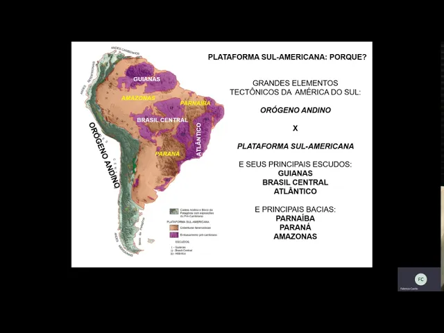 por isso é uma plataforma né o que uma grande parte onde a flora que tá por baixo com o que tá por cima aqui são as coberturas sedimentares né e ela é uma plataforma em relação a isso é lógico que tá aqui bordejando ela que é o horário não dino o grande cadeia de Montanhas a personagem né então você vem com a plataforma que ela é definida em contraste com esse elemento orogênico a cadeia de montanhas que são usando diz que está bordejando ela é uma plataforma sul-americana tem como principais escudos escudo das guianas do