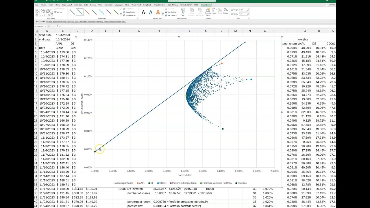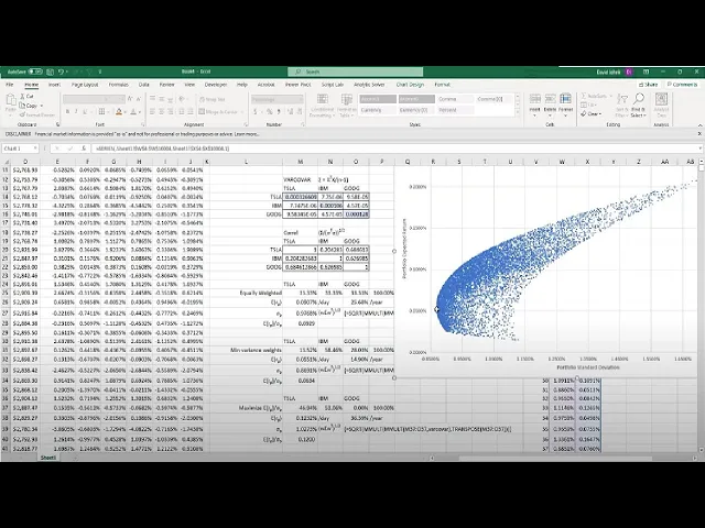 okay i'm gonna show you today how to graph the efficient frontier when you have more than two securities uh most of the time when you do this when people when you see people graph the efficient frontier frontier they just show one security and it's a line so what happens when it's three securities so in order to do that we have to we have let's go ahead and just get the data uh for three free three securities and uh i'm gonna use stock history i'm gonna use the excel stock history function even though it doesn't use the adjusted clothes that i preferred we just want some data anyway so i'll go for start date i'll go to i'll go equals today we'll we'll get like uh around 60 days so i'll go 61 just to get we'll go back 61 days and then we'll go equals today although today is saturday it'll go get the last day there was data usually um let's see how that works and then i'm gonna get we'll go ahead and use the tickers for tesla uh ibm i'm just picking any three i don't really care because i just want to show you how this works and then when you to use stock history i'll just go equal stock history it asks for the the stock ticker and then comma it asks for the start date comma end date and this is a spill function so it spills it spills down and it goes back 60 days and gets the close price like i told you this normally is not good to use clothes praise i like to use adjusted clothes price but but just for a demonstration we can do that on this in this video and here i'm going to go equals uh stock history i'm going to do this again because i don't want the dates so i'll go stock uh start date by the way start date we probably want to f for that because i'm going to copy this across so let me go f4 to put dollar signs and make it absolute and then the end date is here i have for that and then you put three commas and a one and that makes it so it won't show the uh date and we can copy that across since they put those dollar signs and we have the price history for for uh google tesla ibm and google so the next thing we want to do is we want to do the returns and of course we lose the data we lose a day for the returns right so i'll start down here and we'll go equals whatever google equals whatever we have here and copy that across and we'll do the daily the daily percent return is just it's pretty simple is this equal to this divided by this minus one and we see we lose this to eight two because that's why i did 61 right because i knew it's going to lose a date so so you lose it you know i can't do a2 because i don't have a day before that so it looks like it went up just a little bit so i should have a positive return right there's a little bit let's just go ahead and make that percent take it out a few places you can copy this across and send it down okay so now we have that we could call probably call this a daily return all right because because it's going by day um and then and then we're going to later on we're going to need something called the x matrix so let's go ahead and put that right here x and i'm going to go equals again just to get these carry these headers along ctrl z is your friend here something happens you don't like so x is this excess return that's going to be equal to um well you know i'm gonna get back i'll go i'll get back to x so before we before i go to x let's go ahead and do some summary statistics um so i'm just gonna go ahead and uh save time already type these out i'll just put them right here and uh so we'll also use a tesla copy this across so the expected returns is this going to be equal to the average of all all the returns for tesla right so that would be our expected returns and then we want our count because we're going to use that later so i'll go equals uh count how many observations are there and there's 43 observations we'll do the standard deviation of the returns so go equal standard deviation. sample and we get those and we'll copy that across now that's also percents let's go ahead and label it as percent and uh the variance is just equal to this squared rate probably the easiest way to do it and then we'll do what's called the modified sharp the risk the return per unit risk for each one of these securities is that divided by that right and that's a unitless number so just take it out a few places and copy that across all right so now we have some summary statistics for the for for these three and i just basically base that off of those so now we can do x that's going to be equal to the the daily return of each each test law subtract off this expected return so each one of these teslas i would subtract this expected return so i'm going to hit on this m6 i'm going to hit f4 twice because i just want the dollar sign inside the six when i copy this down i always wanted to subtract off this expected return i'm not going to have the dollar sign in front of the m because i want to move to the right when i do ibm and then then we can copy that across and send it down and so i have this all highlighted i'm going to use this later in an equation so i'm going to go so i'm going to have all this all just the numbers highlighted i'm going to go here i'm going to go capital x so i know so now whenever i go here you know i use x when i use x in an equation it's right there it goes there okay so that's that so that actually all ends up if you go here into the formula tab up here and go under name manager and added that in here okay so if i always want if i ever want to edit or remove it that's where it would go okay also and i'm going to go up here i'm going to use that in an equation so i'll call that small n and we'll call these uh standard deviation okay so whenever i use this as an equation i don't have to go highlight them it'll just go get them and that makes it very handy later all right so now we have those that information um the next thing we want to do is uh we want to do something called the variance covariance matrix and this all makes sense in