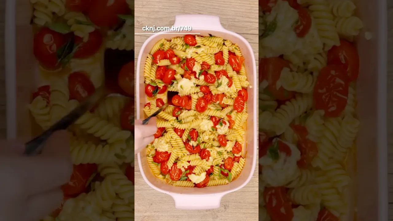 bora aprender o macarrão mais famoso da internet é super simples de fazer a gente fica lindíssimo Você vai precisar de 500g de tomatinhos dois dentes de alho picados e vai temperar com sal pimenta do reino e também azeite agora Você mistura tudo muito bem e no centro coloca o queijo de sua preferência utilizei o camember Coloca mais um pouquinho de azeite e você leva no forno a 200 graus por mais ou menos uns 30 minutos e ó Enquanto isso você pode estar preparando ali o seu macarrão né deixa com bastante sal a água e coloca