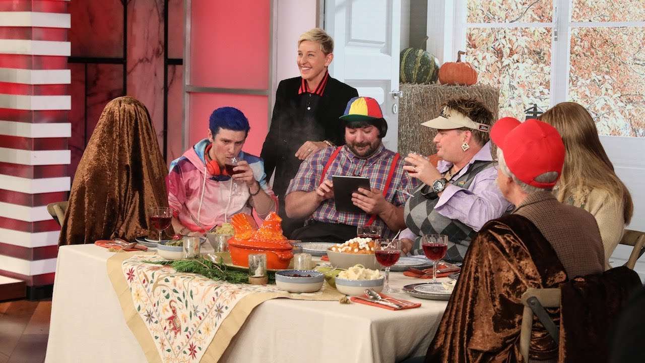 [Applause] so as you know uh or maybe you don't know but tomorrow's Thanksgiving in case you didn't know it is we all know the true meaning of Thanksgiving is great prices on flat screen TVs no it's not it's football that's what it is it's not football either it's being thankful and I think it's important to know how Thanksgiving began so to tell the story of Thanksgiving I've reunited The Ellen degenerous Show players I don't know if you've heard of us we've toured uh all over the country um you know the Book of Mormon we saw