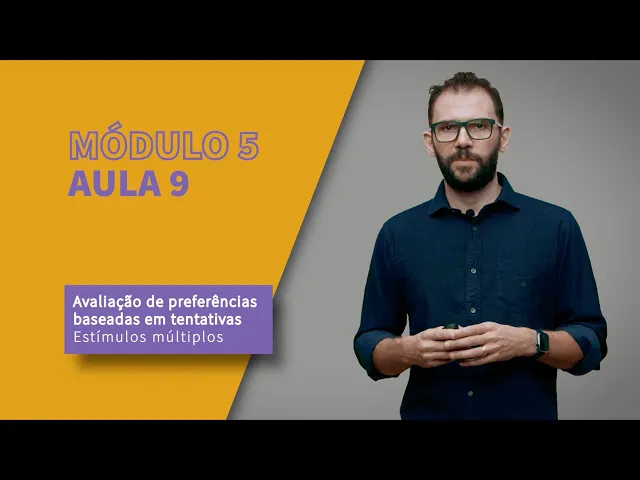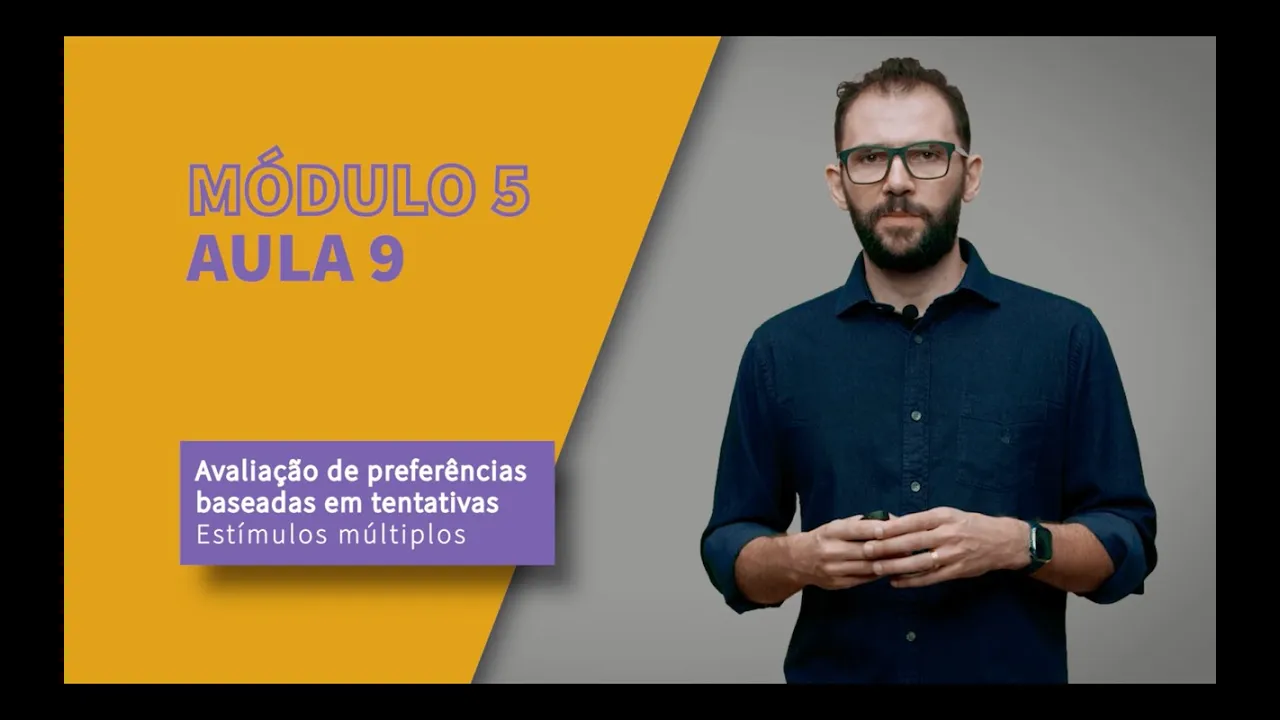 Módulo 5 Aula 9 Outra forma de avaliar as preferências é usando a estratégia dos estímulos múltiplos. Nesse caso, nós ainda estamos falando de baseados em tentativas, então várias tentativas vão ser apresentadas, mas mais de dois itens são apresentados ao mesmo tempo, geralmente três ou mais itens são apresentados ao mesmo tempo. E a criança deve escolher o estímulo preferido dela entre aqueles estímulos que estão ali sobre a mesa.