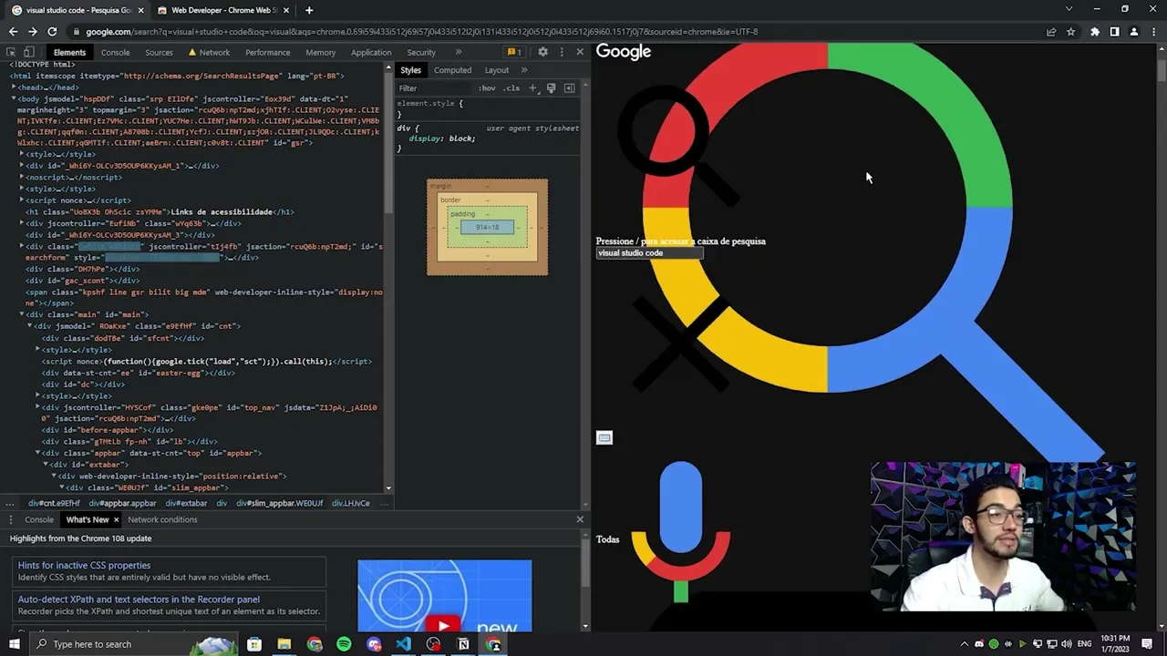 em algo extremamente útil né que é essa página aqui de pesquisa do Google Tá certo então dá dessa introdução aí né Do que é o HTML e o CSS a gente pode começar a falar aqui sobre é eu já falei até sobre o navegador né que você pode estar usando navegadores diferentes O importante é a gente ter um Dev Tools né que é essa isso aqui que eu que eu acessei com inspecionar e com esse Dev to que a gente vai est conseguindo ver a estrutura que a gente tá fazendo brincar com alguns estilos com