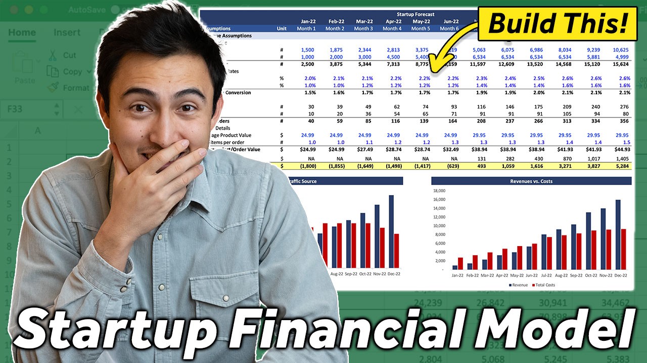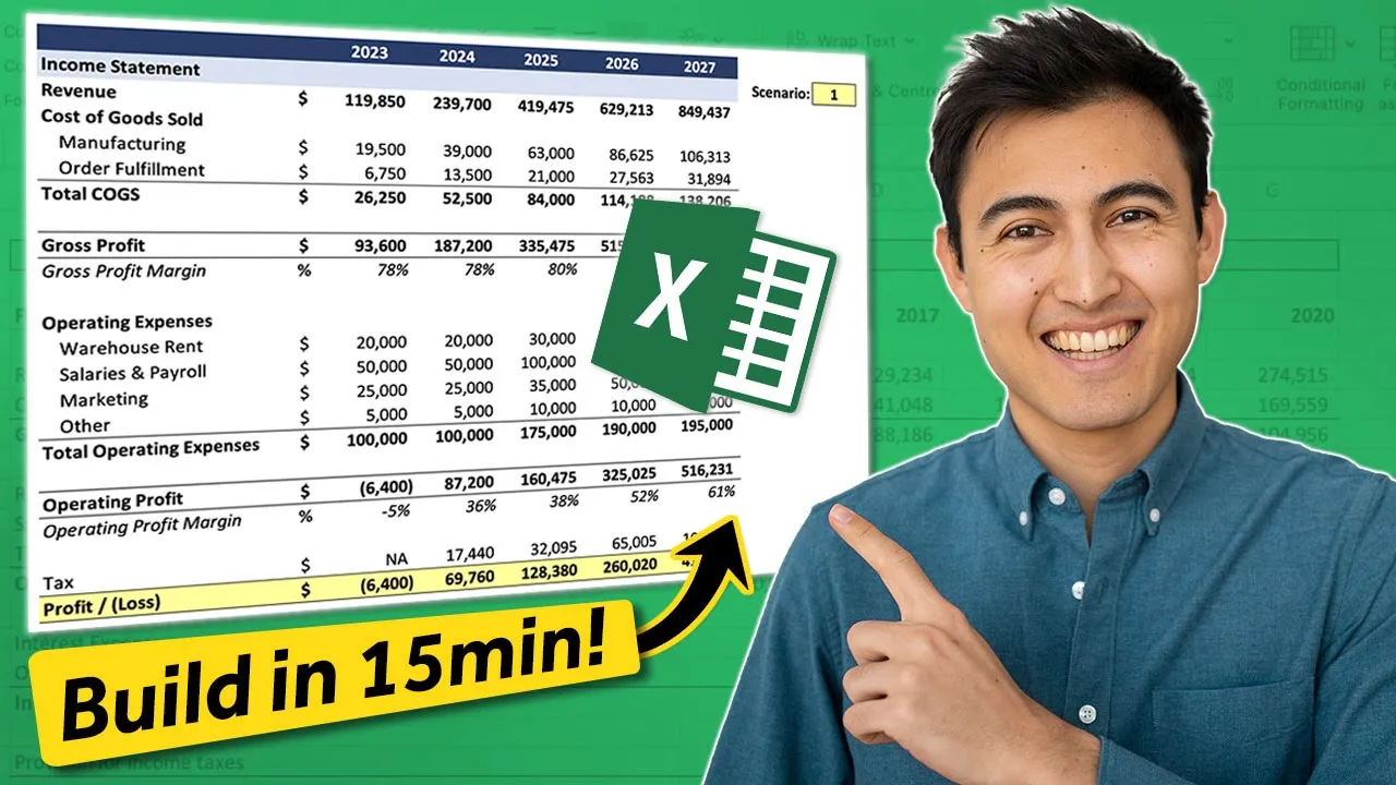 in this video we'll build a simple Dynamic model like this in just 15 minutes first we'll create assumptions to forecast our Revenue then we'll work on our fixed and variable expenses third we'll work on our income statement and all the profit margins and finally we're gonna make a dynamic using the scenario analysis on Excel with a cool formula you might not know so let's get into it so here's the Excel model that we'll be working with which you can download for free in the video description to follow along as you can see we have two main areas one being the income statement which is all of this here and then down below we have all of the different assumptions for a total of five years as you can see up over here let's assume that this is for an e-commerce business so it could be like an online clothing store first up here to forecast our Revenue we're gonna need to look at our assumptions so if we scroll down towards the bottom here you can see that for Revenue we have a few different assumptions first we've got the number of orders which we're seeing we're starting at 3 000 orders and then we've got the average order value so the price times the quantity is going to give us the total revenue and to forecast this forward we simply have a border growth rate here let's suppose that we're hoping to grow by a hundred percent on the first year and then 75 50 and finally 35 percent so with this information we can go ahead and scale out the number of orders so we would just go equals this previous year's figure multiplied by in Brackets we're gonna do one plus the growth rate which is 100 in this case close the parenthesis and just hit enter there and then once we have that first number we'll go shift right and hit Ctrl R there and you might have noticed here that some numbers are in blue While others are in black and generally the convention here is that the blue numbers are those that are hard coded so you just type them in yourself while the black ones here are Dynamic so they're linking to something like a formula or a cell now that we have the number of orders we can also work on the average order value let's assume that this stays fixed throughout the five years so we'll do Ctrl V there and now we can work on the first line item for us which is the revenue this is going to be equals to the number of orders so the quantity multiplied by the average order value so the price and hit enter there and again we'll do shift right and hit Ctrl R there now that this first step is done we can now move to our expenses we're going to have two main types fixed and variable expenses so you can see if we scroll down to our assumptions we have them per order so these are the variable ones meaning that they change per every order that is made and then down below we have those that are fixed in nature so things like salaries are gonna stay fixed same thing goes with our marketing expenses so let's go ahead and scale these out so for manufacturing we're saying that it costs us 6. 5 dollars to say create that T-shirt and we can simply drag that across and just hit Ctrl r same thing goes with order fulfillment so this is things like putting it in the package and getting it delivered so we'll hit Ctrl R there again one thing you could do depending on your assumptions is maybe as you have more orders this is going to start to get a bit less as we're going to have economies of scale there so if we order in bulk we're probably going to get some lower prices then further down below we have the warehouse rent let's suppose that this stays fixed salaries and payroll marketing so this is how we're actually going about selling this stuff and other so this could be things like accounting or legal fees let's just scale this out by hitting shift right and Ctrl R again let's suppose that for warehouse rent as we have more orders we could switch this out to something like 30 000. hit enter there and just drag that across and Ctrl R again same thing with salaries maybe as we get more orders over here it's it's a bit too tiring to only do it with one person so we might double that to a hundred thousand and again we'll drag that across and for marketing as well maybe to reach this type of order numbers we need to scale this out so we need to make this bigger maybe we do something like 50 000 here and eventually we're gonna reach a hundred thousand same thing over here like so and finally for other we'll leave this fixed right now we've made these assumptions in a fairly simple Manner and later on we're going to create the different scenarios so this could be for example an optimistic case and we're gonna have a different set of assumptions for a pessimistic case so we can kind of adjust and see how that would look finally we've got the corporate tax rate in this case we just said it's 20 we'll hit Ctrl R there this is obviously going to vary depending on where your company is incorporated with all this information we'll now be able to bring it up to the income statement and speaking of financial statements if you're looking to learn more about financial modeling you can consider checking out our complete finance and valuation course where you can learn all about financial accounting Corporate Finance valuation and financial modeling on Excel first we cover financial statement analysis using Apple's real annual report as an example then we'll get into Financial modeling through a three statement model after that we'll begin the valuation phase where you learn to do a discounted cash flow a comparable company's valuation and a present transactions valuation on Adobe looking at the real financial statements to eventually derive evaluation range lastly we'll show you how to present an investment thesis using a stock page format so if you're interested in checking it out head out to the link in the description below alright back to the video now that we've calculated all of the assumptions we can work on the income statement and 