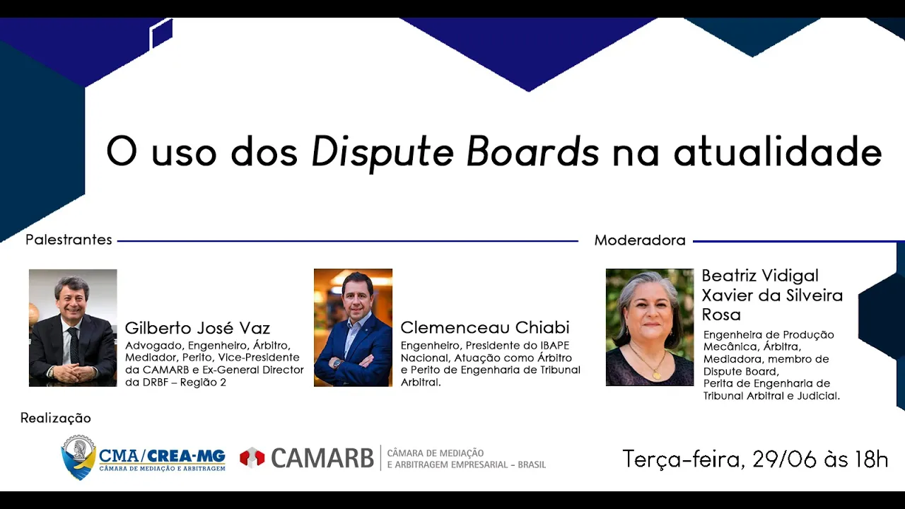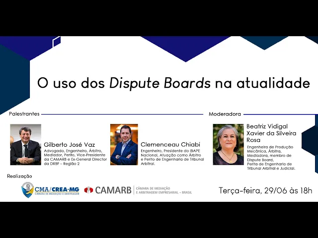 do da BRF EA fundação de bordo americana eo clima sorteado Engenheiro mestre em engenharia mecânica árvore perito de engenharia de tribunal Arbitral e vocês contam também um nível modestamente estou moderando esse debate sou engenheiro de produção mecânica árbitra mediadora membro do board e perito de engenharia de tribunal arbitral ou judicial de uma maneira bem objetiva para que o Oi gente ainda não conheço futebol possa tomar contacto com o tema pela primeira vez o disco board ou comitê de resolução de disputas como é tratado na câmara do CREA de Minas é uma alternativa não Adversarial em