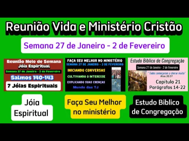 Olá meus queridos irmãos e amigos sejam todos bem-vindos mais uma vez aqui no nosso canal mundo das Testemunhas de Jeová nesse vídeo nós estaremos fazendo a nossa reunião vida e Ministério Cristão da semana 27 de janeiro a 2 de Fevereiro tenho certeza que será gratificante para nós acompanhar esse vídeo Então vamos para o nosso vídeo [Música] então sejam todos bem-vindos mais uma vez aqui no nosso canal É um prazer imenso ter vocês aqui semanalmente para juntos prepararmos a nossa reunião Como dito estaremos fazendo agora jois espirituais da semana 27 de janeiro a 2 de Fevereiro