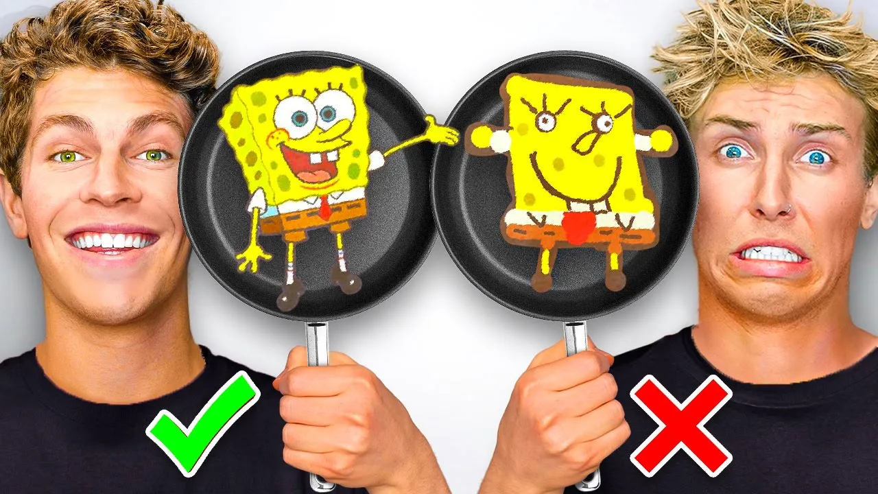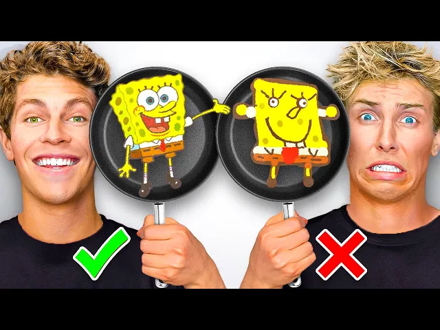 make the best pancake art win $11,000 today we're going to be making pancake art but every round will have to spin the wheel of Doom if it lands on your name you have to cook the pancake with a terrible disadvantage that means being handcuffed seeing everything upside down or even wearing a mask and the person with the least amount of points by the end of the video will have to eat dereck's mystery pancakes who's going to win the ,000 and who's going to eat the gross pancakes we're going to have to find out let's go