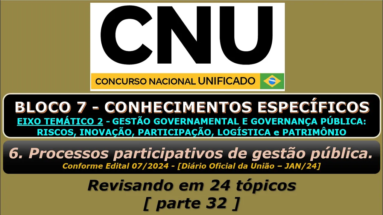 processos participativos de Gestão Pública processos participativos de Gestão Pública São mecanismos fundamentais para promover a inclusão e a transparência na tomada de decisões governamentais permitindo que os cidadãos participem ativamente na definição de políticas públicas e na alocação de recursos alguns dos principais processos participativos incluem conselhos de gestão são órgãos colegiados compostos por representantes do Governo e da sociedade civil que tem a função de debater e propor diretrizes fiscalizar e acompanhar a implementação de políticas públicas em determinadas áreas como saúde educação meio ambiente entre outras os conselhos podem ser consultivos ou deliberativos dependendo de sua estrutura