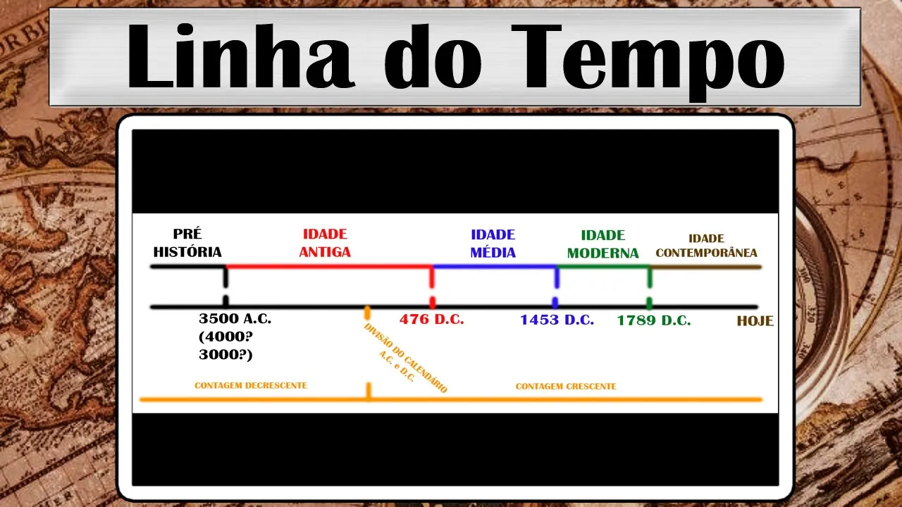 oi e aí pessoal beleza estou aqui hoje para começar a nova série que eu prometi para vocês que é série de aulas de história certa uma série que é muito tempo que eu tenho vontade de fazer e que enfim não tem data para acabar tem vários temas aí que eu quero trazer e essa é a primeira aula então espero que vocês gostem espero também que vocês compartilhem ela aí com as pessoas que vocês sabem e gostam do tema que as pessoas que vocês sabem que precisam aprender mais sobre o tema porque esse é o intuito é eu que sim sobre o sol da área falar sobre uma coisa que eu gosto de falar e você que tem interesse em aprender a absorver mais conhecimento certo eu disse no vídeo da apresentação se você não assistiu você pode vir esse vídeo por aí eu acho que eu vou fazer uma playlist vou colocar ele em primeiro eu não fiz ainda mas talvez quando você assistir esse vídeo playlist vai existir os dois a não ser mais gerais certo e presta primeira aula que eu espero que ela não seja muito longa eu tô trazendo um tema aqui que pode parecer até um ter idiota sinceramente pode parecer até um tema bobo mas ele é um tema que muitas pessoas têm dificuldade em saber e eu acho essencial que as pessoas saibam quando as coisas aconteceram na história certo por isso que eu estou trazendo aqui é linha do tempo e vou tentar explicar para você como você se situa na história como você sabe quando aconteceu o quê porque isso é algo que eu sinto que as pessoas têm extrema dificuldade não todos é claro mais um grande número de pessoas têm extrema dificuldade em saber certo eu mesmo dando minhas aulas de história para ele é já perguntei várias vezes para para para algumas turmas assim é quando isso aconteceu e a maior das pessoas parece uma linha assim cri cri cri no não sabiam da última ideia de quando tinha a ter uma vez que eu fui falar para uma audiência também de pessoas leigas certo tava com público aí de com certeza mais de 50 pessoas talvez 70 não lembro ao certo mas eu ia falar sobre um assunto que envolveu muita coisa do mundo antigo e eu perguntei para aquela audiência quantas pessoas tem dificuldade em saber quando algo aconteceu ou quantas pessoas não têm ideia aqui sobre quando aconteceu o quê e a maioria das pessoas levantou a mão e isso é eu percebo até conversando com alguns várias pessoas chegarem me falaram olha eu tenho dificuldade em saber quando que isso aconteceu então eu acho por bem trazer essa aula uma aula universal para ajudar você a se situar a história certo e a mala assim que eu sempre vou recomendar ela pelo menos eu pretendo fazer isso né espero que eu lembre nas aulas futuras falando se você não sabe quando aconteceu isso esse tema que eu estou trazendo veja a aula número um que eu explico a linha do tempo então é bem universal e vamos continuando aqui então como já expliquei é comum pelo menos para mim ouvir perguntas e afirmações como com essa aconteceu eu não sei o que foi antes o que foi depois ir até mesmo confusões tem pessoas que não sabem direito é por exemplo já vi gente colocando a era viking no império romano que seria a historicamente uma do surdo mas muitas pessoas não sabem né ou porque nunca estudaram ou porque não tem muito interesse ou porque simplesmente não tem ninguém ensinou então é isso que eu vou tentar fazer com que você entenda aqui nessa primeira alta certa então vamos deixar de apresentações vamos deixar de teorias e vamos seguir em frente certa para eu explicar linha do tempo eu vou primeiro mostrar a linha do tempo geral e depois eu vou explicar especificamente cada uma certo claro que eu vou falar tudo que aconteceu mas eu vou citar alguns eventos conhecidos aí para que você aprenda a se situar bom vamos lá e essa é linha do tempo certo eu tenho peça agora para que você olhe exclusivamente para mim do tempo que eu vou explicar para você todas as eras enfim depois eu vou falar uma eu vou mostrar slide por slide uma coisa vou dar um um em cada pedido de vou falar sobre ele separadamente então olho agora na linha do tempo eu vou lá aqui também e aí nós vamos ver primeiro de tudo nós temos a pré-história certo antes de você começar a estudar e a história aparece clássicas aqui o que eu gosto de chamar que são são as histórias mais famosas aí você vai ter a pré-história certo quer aquele período os homens das cavernas eu vou falar depois a pré-história vai desde o surgimento do homem até o ano aí as datas ela se confundiu um pouco porque eu vejo o pessoas datando em épocas diferentes e enfim eu não acho que a gente consiga definir uma data 100% eu já vi gente da tela em 3. 500 onde fiz eu coloquei 3500 aí porque é uma data aproximada eu achei uma data um meio termo aí tá mas você vai ver pessoas da tela 14 mil antes de cristo e você vai ver pessoas atacando e em três milhões de clientes enfim vale aí também você deve considerar que em cada região do mundo talvez saiu da pré-história em um período diferente tá porque que a gente fala que deu fim a pré-história a invenção da escrita então antes da invenção da escrita você tem a pré-história certo quando o homem ainda era analfabeto tudo mais você tem nessa pré-história período paleolítico e neolítico é todas as os homens das cavernas enfim toda essa essa parte que eu vou falar um pouquinho depois isso é tudo antes da invenção da escrita tá a invenção da roda por exemplo pra deixar a história é isso tudo antes da invenção da escrita então é tudo o que acontece antes da invenção da escrita é chamado de pré-história ok e ela termina aí por volta do ano 3500 de cristo como mas eu como eu falei eu já vi gente dando 3. 000 gente da tela 4 mil então coloquei 3500 para ser um meio-termo neste período e depois da pré-história como você pode acompanhar na linha do tempo aqui você tem a idade antes hoje eu vou falar dela mais tarde c
