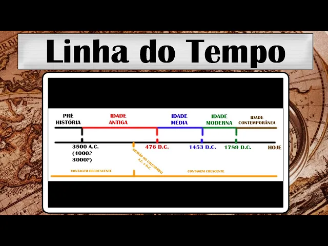 300 tá essa idade média central coisa que a gente não faz aqui na escola você não vai aprender a ser na escola como você está no brasil e a nossa vertentes o gráfico dividir a idade média em duas partes tá então você não vai aprender essa última parte aqui mas eu acho por bem dizer porque eu gosto mais dessa divisão em três partes aí eu acho que ela mais acurada uma divisão em três partes assim enfim e você tem a lei que miley diz que ele chama também que seria correspondente mais ou menos a nossa baixa idade média que vai do século 14 até o século 15 tá ou seja mais ou menos aí dos anos de 1301 dependendo do historiador vai dar o século 13 também enfim até o fim da idade média é só que geralmente atribui essa divisão para idade média coloca o fim dela não 1453 mais um pouquinho depois coloca o fim dela lá para os 1. 500 tá já vi até alguns historiadores colocar um pouco depois 1500 tá eu já gosto mais dela terminar em 1453 mas isso é uma mera divisão tá é isso não significa que vai alterar seriamente seus estudos é a mais uma questão de um pensamento da história dividir uma forma e outro pensamento dividir outro eu gosto mais do segundo pensamento embora não concorde com o término derme 1500 ah mas isso é outra história mas só para você saber que dentro da idade média existem outras divisões ok podemos passar para as últimas então que seria a idade moderna o que acontece na idade moderna como vocês vem aí eu coloquei um de novo que ela começa em 1453 e termina com a revolução francesa em 1789 e o quais os fatores que marcaram que são conhecidos seus que são modernos da idade moderna são as grandes navegações sem por exemplo colonização da américa o descobrimento do brasil enfim a chegada dos europeus no brasil e na américa como um todo ea colonização você tem a reforma protestante aconteceu durante a idade moderna a independência dos estados unidos foi durante a idade moderna então todas essas esses eventos aí marcantes que magicamente que você estuda na escola você vai estudar muito colonização da américa o absolutismo eu poderia ter colocado aí também é uma coisa que marca bastante a idade moderna certo então tudo isso a idade moderna é aquele tempo que as pessoas que lhes causavam aquelas piroka branca é no nas cortes nos tribunais risos aquela roupa colada apertar no salto alto isso daí a idade moderna certo período colonial tudo é dentro da idade moderna certo entre a basicamente tudo que vai de 1453 a e 789 coloquei algumas figuras para você ver aí por exemplo na caravela típico da idade moderna é uso europeus chegaram à américa como eu já disse é aquela guerra ficou aquele simples que você atira e depois você tem que ir só com a pólvora carregar e até de novo enfim isso daí tudo a idade moderna beleza e por fim a nossa idade a contemporânea certo como já tinha dito anteriormente começa com a revolução francesa de 1789 e vai até os nossos dias vai até hoje que aconteceu alguns fatores marcantes da idade contemporânea que não foi dividido ainda depois da idade moderna nós temos um napoleão bonaparte ele é muito próximo da moderna é verdade mas ele é idade contemporânea já você tem independência do brasil por exemplo durante a idade contemporânea você vai ter o imperialismo aquela colonização da áfrica da ásia partilha da áfrica que você estuda na escola aí isso tudo vai ser durante a idade contemporânea também você tem a primeira e a segunda guerra mundial a corretora você tem a guerra fria aquela famosa briga dos estados unidos e união soviética isso é idade contemporânea você tem o seu nascimento você a não ser que você tenha nascido antes de 1789 você nasceu durante a idade contemporânea tá então tudo que vende 1789 até hoje a onze de setembro a guerra do iraque a chegada do homem à lua é tudo isso é idade contemporânea coloquei algumas figuras para você o surgimento da internet eu posso dizer também mesma coisa muito marcante que eu acho que revolucionário né chegou aí também durante a idade contemporânea então você veio napoleão bonaparte que eu coloquei ele é bem perto da moderna como eu disse mas é contemporâneo e você tem também uma foto do dia de você passou na segunda guerra mundial idade contemporânea certo então eu espero que depois explicação você tenha entendido qualquer dúvida deixe nos comentários mas essa é a linha do tempo é assim que você vai contar em pó e assim que você vai se situar na história ok agora um bônus para acabar como você compra os séculos porque às vezes o historiador fala assim isa aconteceu no século 13 a legal quando foi isso tá é isso aconteceu no século 16 a legal quando foi isso tá então vou explicar para você aqui como você conta o séculos é muito fácil é coisa de matemática básica embora se eu falhar em explicar alguma coisa desculpa eu não dou aula de matemática eu sou ruim de matemática para falar a verdade então senão uma coisa que talvez eu tenho muita facilidade mas vamos lá vamos tentar você contra os séculos assim você pega os dois primeiros algarismos os dois primeiros números e só não é isso tá por exemplo 1248 quais são os dois primeiros algarismos 12 é 12 forma o número 12 é só mão então o século 13 ta2020 o ano atual aí que eu tô gravando esse vídeo quais são e é 20 né então só um 2020 século 21 tá você tem 308 pô eu vou pegar o número 30 não quando a três números nesse caso é como se tivesse 10 antes do três então eu pego 03 né ou só o número 3 é porque são apenas três anos e você só um então que ano que é 308 séculos e séculos culpa século quatro vamos fazer um exercício é o anno de 1789 onde da revolução francesa que século foi pega os dois primeiros números 17 né 1789/17 os dois primeiros são da século 18 ok pego ano quatro moça ano quatro só tenho o número n