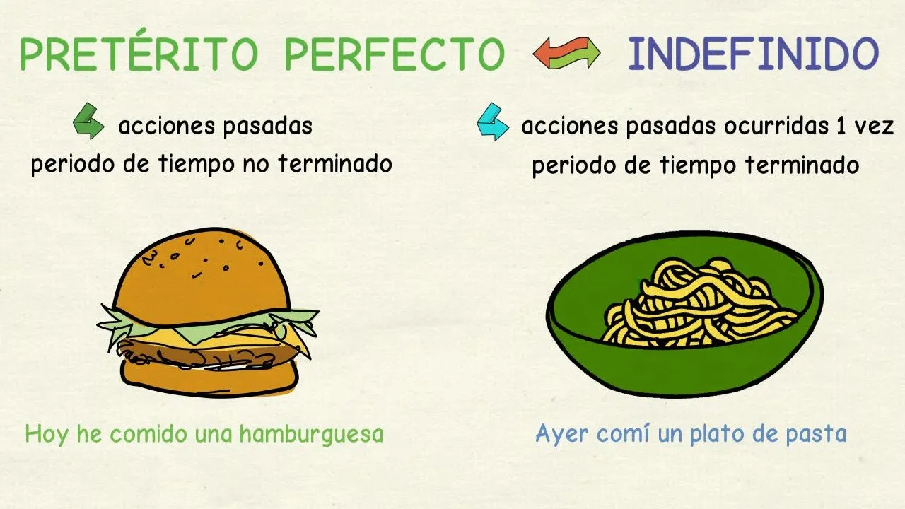 de acciones pasadas ocurridas en un periodo de tiempo no terminado hoy, esta semana, este mes este año, este siglo, etc. Hoy he comido una hamburguesa Por eso, es también el tiempo verbal que usamos para hablar del número de veces que hemos hecho algo durante toda nuestra vida desde que nacimos hasta el presente nuestra vida no está terminada y, por eso, esas cosas pueden cambiar Nunca hemos estado en la India Por el contrario, utilizamos el pretérito indefinido para hablar de acciones pasadas ocurridas una vez en un periodo de tiempo terminado ayer, el + día / fecha,