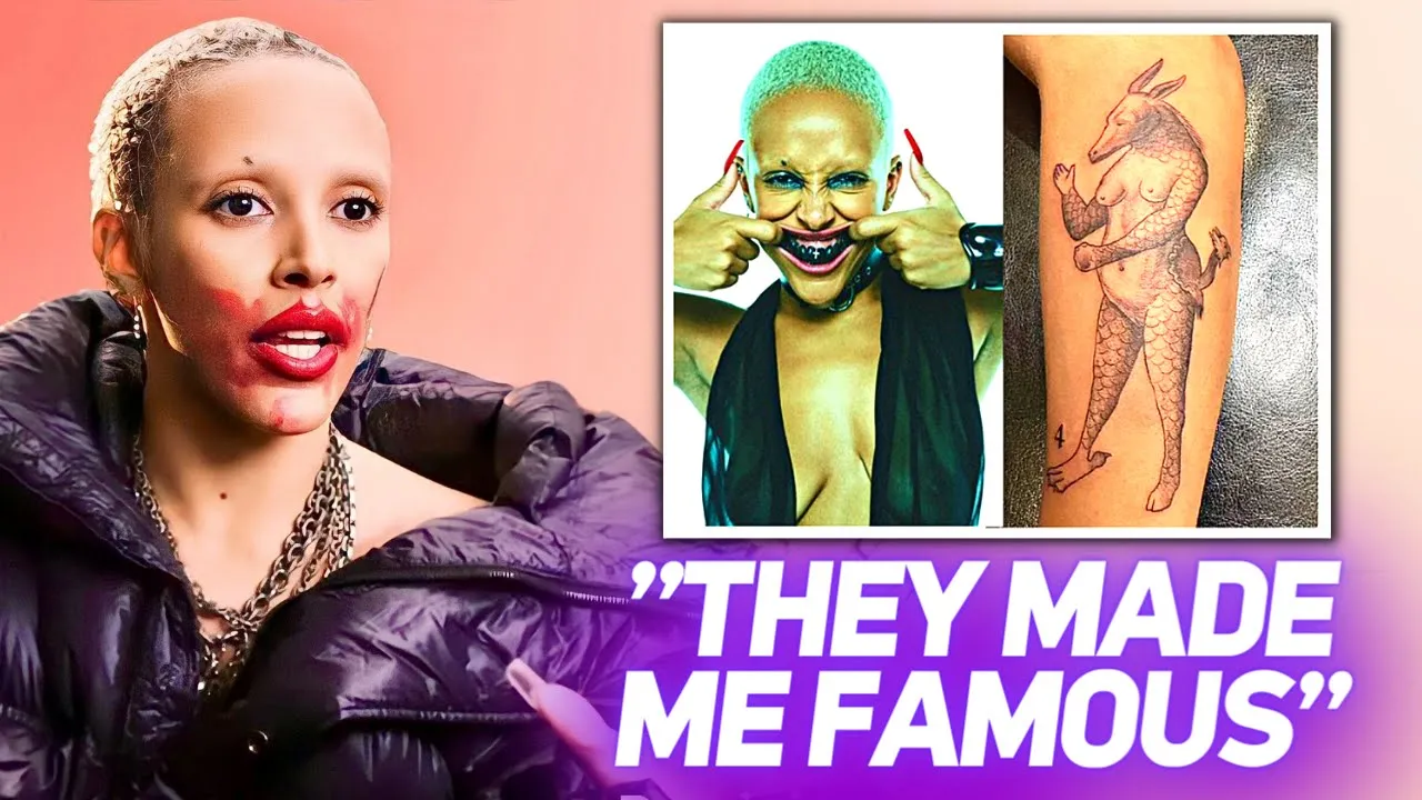 this and it got people dragging her once again then someone said get the Illuminati symbol as a tattoo next and Dojo replied dude I will just watch me well a couple of days ago she officially debuted a new tattoo and people immediately started calling her out for being demonic Ace Satanist being in the Illuminati and all sorts of stuff it was m-e-s-s-y she got dragged to new heights and she eventually had to explain that it wasn't satanic posting a couple of explanatory pictures with the caption your fear is not my problem one of the slides