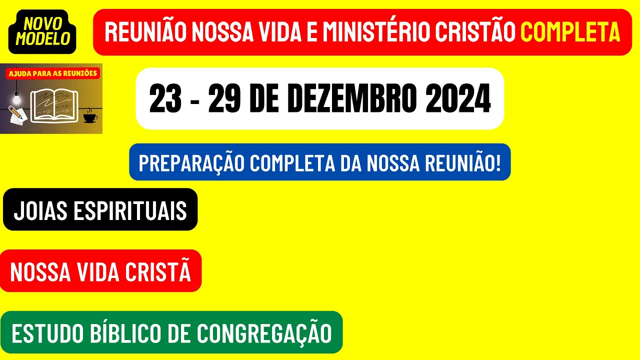 sejam todos muito bem-vindos ao nosso canal ajuda para as reuniões Esperamos que Jeová esteja com cada um de vocês queridos e amados irmãos e neste vídeo vamos estar disponibilizando a reunião nossa vida e Ministério Cristão completa desta semana 23 a 29 de Dezembro de maneira objetiva vamos analisar e preparar as partes principais desta reunião que são aquelas por perguntas e respostas onde podemos no dar nossos valiosos comentários e nesse ano vamos ver que joias espirituais podemos encontrar na leitura do Salmo 119 verso 121 a 176 Lembrando que esse texto é a base de toda a