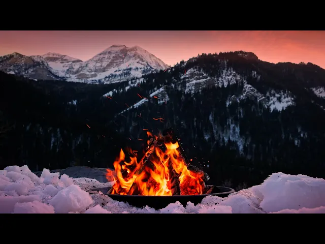 Scenic Winter Sunset Campfire with Snowy Mountain Views and Crackling Sounds