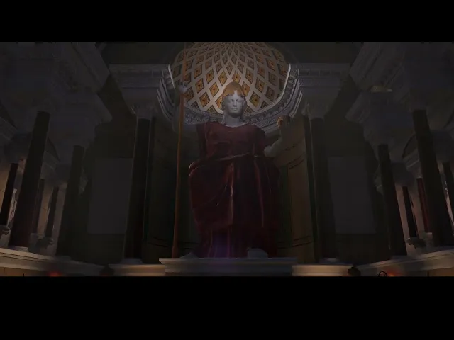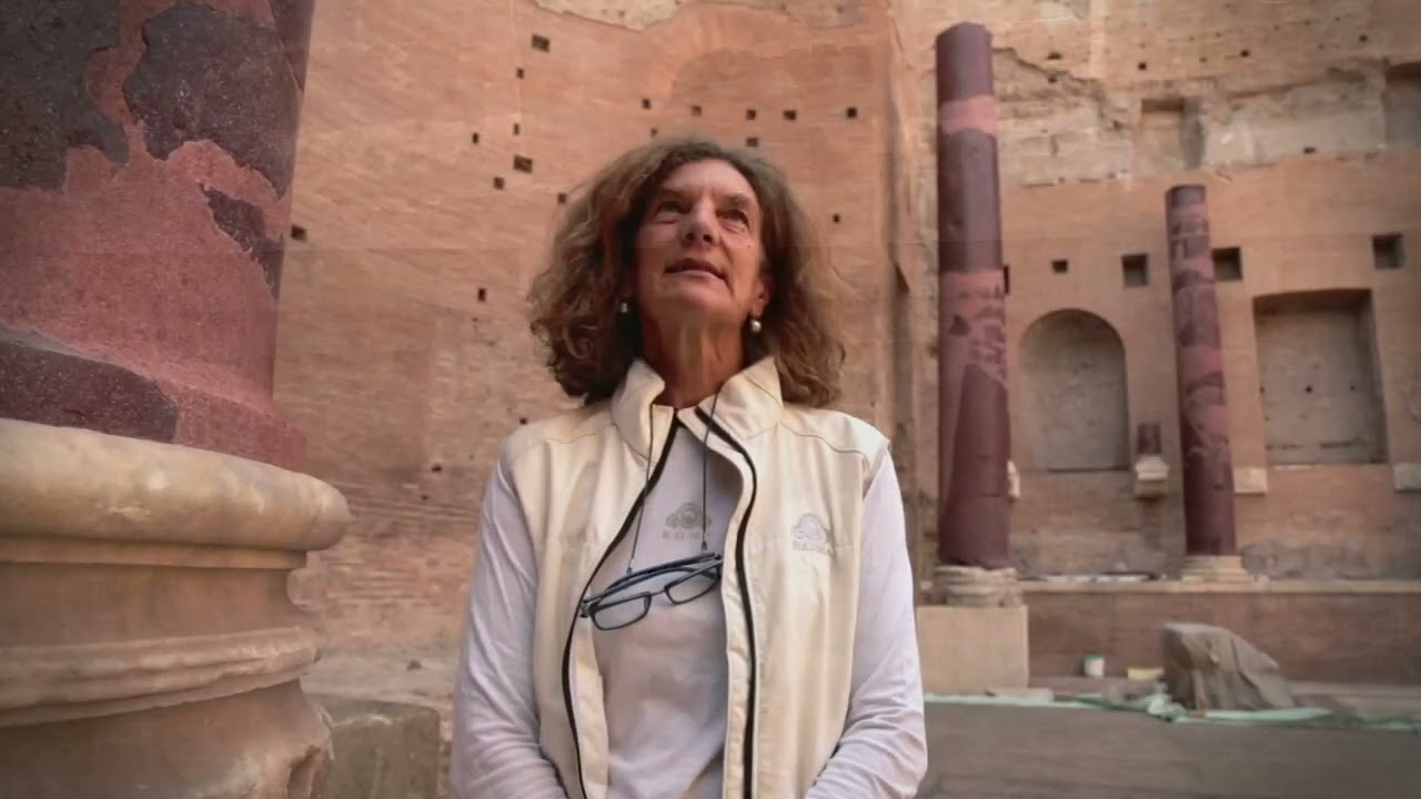 dalla testa Leonina che scandivano la decorazione della cornice tutti i capitelli erano Corinzi ma il diverso trattamento dei flussi delle colonne scanalati quelli di marmo bianco lisci quelli in granito Cipollino creava un potente gioco chiaroscurale [Musica] alla cella erano normalmente ammessi solo i sacerdoti e le sacerdotesse del culto mentre all'esterno si svolgevano le cerimonie e i sacrifici nell'abside al di sopra del Podio si ergevano le maestose statue delle Den trono Roma eterna personificazione sacra della città e del suo dominio sui territori dell'impero e Venere felice dea della fecondità e progenitrice di Enea e dell'Urbe il