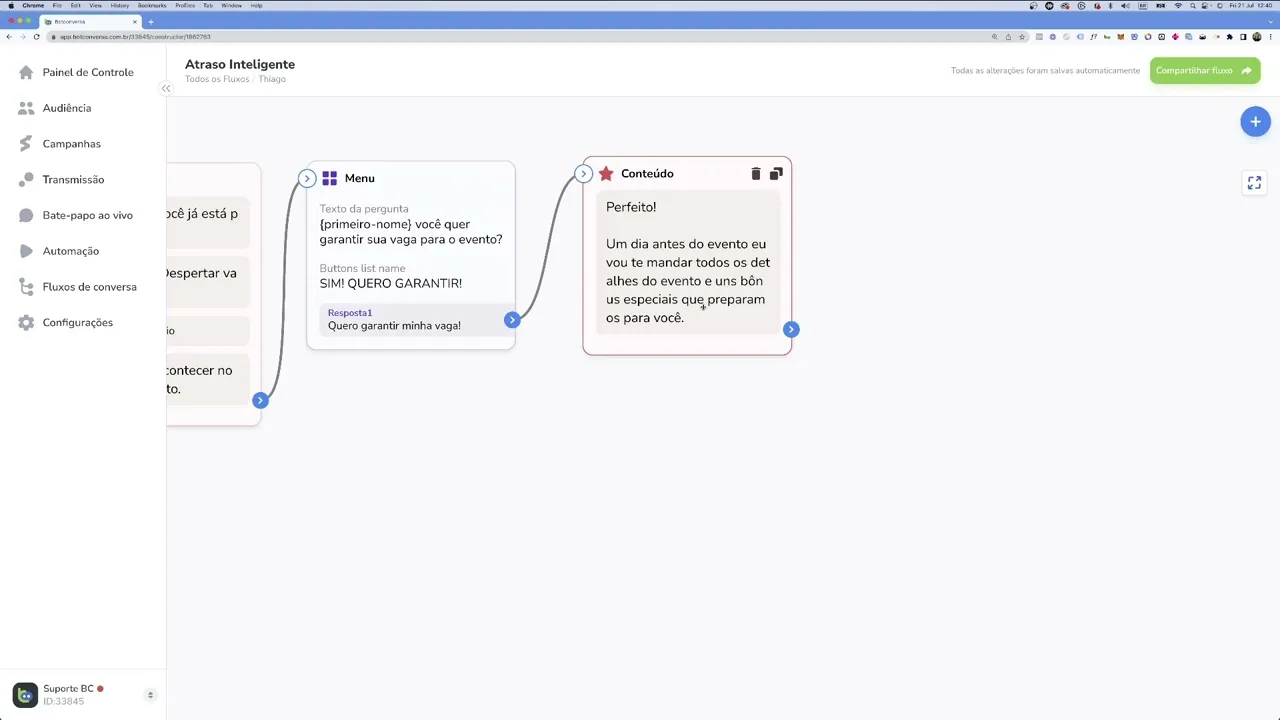 tava fazendo aqui fica mais fácil dela entender Qual é o próximo passo que é só assim garantir a vaga E aí ela continua E aí beleza assim que ela continua a gente fala olá a gente falou perfeito um dia antes do evento vou te mandar todos os detalhes e uns bônus especiais que preparamos para você o que que a gente pode fazer aqui agora como que a gente pode continuar essa conversa lá para o dia do evento um dia antes do evento utilizando o bloco de atraso inteligente esse bloco de atraso inteligente aqui ele funciona