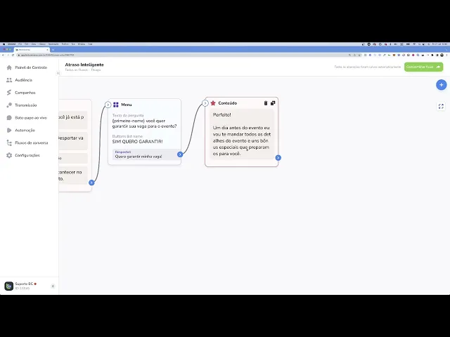 Olá tudo bem Seja bem vindo esse vídeo nesse vídeo vou te explicar como é que funciona o bloco de atraso inteligente dá uma olhadinha nesse fluxo aqui ó nesse fluxo começa dessa forma aqui ó a gente fala olá seja bem-vindo como você se chama a pessoa fala pra gente qual que é o nome dela depois a gente fala prazer primeiro nome e a gente mostra algumas opções aqui vamos dizer que no nosso menu aqui a gente tem um evento que vai acontecer no nosso negócio e a gente e a primeira opção do nosso menu é