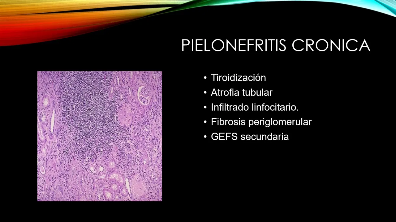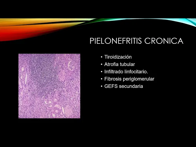 voltear iciar crónica con lesión tubular de cálices y pelo y renal se asocia al reflujo y se caracteriza por una por la presencia de fibrosis inflamación crónica que puede presentarse clínicamente silente sin manifestación pero si a largo plazo debutar como una insuficiencia renal crónica la piel une fritis crónica se caracteriza por presentarse en forma silente aunque puede tener antecedentes de cuadros repetidos de pielonefritis a una macroscópicamente el riñón está disminuido de tamaño atrófico y en su superficie presenta cicatrices que retraen la cápsula renal en la histología vamos a ver tiroides acción que es la presencia