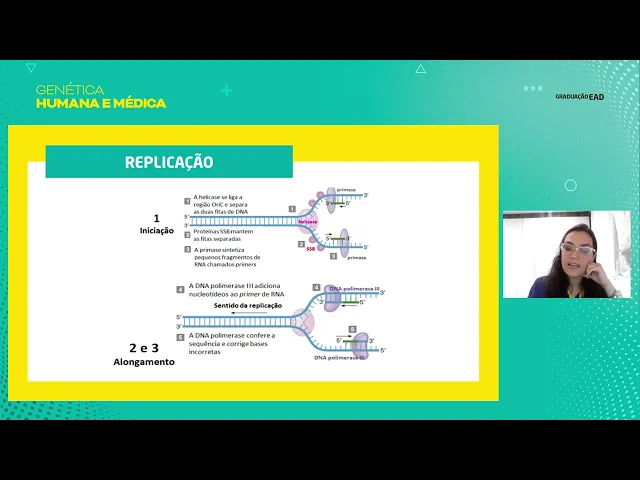 Já na estrutura quaternária, é o cromossomo finalizado. Então, toda compactação dessa minha hélice, dessa dupla fita do DNA é para formar esse cromossomo condensado e compactado no final, esse material genético, ele precisa, a cada divisão celular, que nós mencionamos anteriormente, ele precisa se replicar. Nesse processo de replicação, nós temos três estágios: a iniciação, o alongamento ou extensão e a finalização.