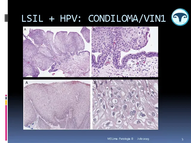 líquenes cleros o a ese pin le vamos a llamar bean diferenciado siempre es un alto grado histológico entonces fíjense que cuando nosotros histológicamente observamos un pin podemos tener lesiones de bajo grado que van a estar asociadas siempre a hp con el ecyl vulvar donde las lesiones pueden observarse a modo de condilomas exóticos o a modo de lesiones planas que les vamos a llamar vino ahora cuando nosotros tenemos una lesión de alto grado puede deberse a un hp uve ese sería el hachís y el vulgar que le vamos a poner esa denominación pero cuando no está