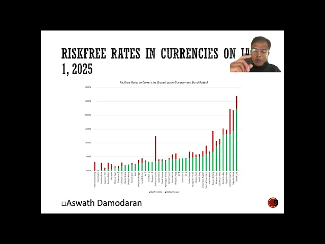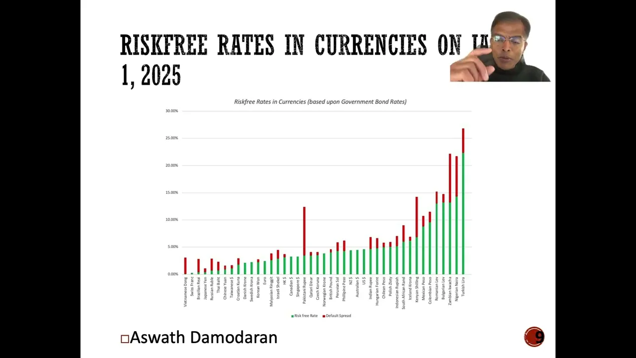 5 2% amazing impressive but it's still in nominal Pacos unless you bring inflation into the picture you cannot just look at a normal return index said that was a good return so here's what I'm going to do to get returns that are comparable across countries across region first I'm going to look at all publicly traded stocks in every market so I'm not going to pick an index I'm going to pick this is part of what I at the start of every year where I download the data in every publicly traded stock I then use market caps all converted into US dollars that way the return will be in dollars and you can compare them across markets and the way I'm going to come up with the market cap of the in each each country is I'm going to add up the market cap of every listed company in that market so if you take Poland I take every traded stock in Poland add up the market caps at the start of 2024 at the end of 202 before compute the percentage return so it's like a weighted return then because if a large company does well it's going to have a much bigger effect than if a small company does well so here's what the world looks like if you convert everything in dollar terms and I've broken down broadly into regions with a few countries thrown in the best part of the world to invest in 2024 and I think you saw this from our very first post was the United States in fact if you look at across much of the world it wasn't a great year in dollar terms you got us you got India and then everything else is single digit returns and some of negative returns for the most part 2024 was a ho home year in terms of dollar returns for much of the rest of the world outside of the US and India now actually the US outperforming its Global counterparts everybody outside the US is not something new for much of the last 15 years us stocks have outperformed investing in a global index and that's befuddled people because we were all taught that you should diversify that you should bring in foreign stocks into your portfolio that lesson got passed on the 80s and '90s we took it to heart we invested outside and for the last 15 years people invested only in US Stocks have beaten us now 15 years is not a long time in US market history so you could argue that this two shall pass but I think there's another reason why investing just in US stocks doesn't carry the consequence it did 40 years ago say you invest in US Stocks the biggest stocks are in the S&P 500 and the Very biggest of them are the MA 7 take a look at the MA 7 and look at where they get their revenues they are us companies in terms of incorporation but they get their revenues globally so maybe US Stocks you're capturing a global index and that's what you seeing here so those are the returns I did decide look at individual countries to see which were the best performing in the worst performing markets remember Argentina 172. 5 2% return in the index I cautioned you that that was before inflation well even if you factor in inflation and the exchange rate effect Argentina was the best performing Market in 2024 you got Bulgaria Kenya Pakistan Croatia I mean this is a list of countries we don't think of having invested a lot of money many of them are small markets but 2024 was a good year the worst performing Market in 2024 was Brazil down 29% in dollar terms followed by Mexico and then you got Bangladesh Egypt Etc a couple of these countries had political crisis going through so maybe that that played out that played a role so you can see the best performing and the worst performing markets so when you look at returns you look at what the what a country slm market did in 2024 now one reason the index return and the dollar return deviate is because of exchange rate effects so I decided to take a look at the US dollar in 2024 against three indices the first is an index of Emerging Market countries you're saying how do you classify them I don't I use the Federal Reserves if you don't like the classification take it up with them so the Federal Reserves data set Fred maintains these indices against emerging and developed markets and guess what the dollar was stronger against both but a little stronger against emerging markets 10. 31% than developed markets there's also a broad index against all currencies across all markets and the dollar appreciated by about 9% in 2024 now once we've opened the door to currencies might as well walk in he's saying well so what drives differences in interest rates across currencies so put differently if I'm valuing a company in Egyptian pounds or Pakistani rupees or Indonesian rupe or Brazilian R how would I come up with the risk freting so let me set up something that I think is critical if you're an investor knowing what you can make on a guaranteed investment is critical to investing sensibly a risk free rate so here are the three scenarios you might face from most from easiest to most difficult first question I'm going to ask you is does the government in the currency are interested in issue long-term bonds which are traded and if the answer is yes and there is no default risk in the country then I can use the Government Bond rate as a risk free rate so if you're interested in getting a risk free rate in Swiss ranks not a problem there's a 10e Swiss rank Government Bond rate I take that rate and that becomes my risk free rate so there's no default risk you say how would I know if there's default risk I cheat I use the Sovereign rating for a country and as you know Moody S&P Fitch all rate countries and if a country has a AAA rating I make the assumption that there's no default risk you're saying that's dangerous I agree but think of how how much work it saves just taking that shortcut so if you're looking at a currency where there is at least one entity with no default is issuing long-term bonds at currency your home free use the government bond rate same rational I use for using the German Euro bond rate is the risk-free rate in Euros he's saying