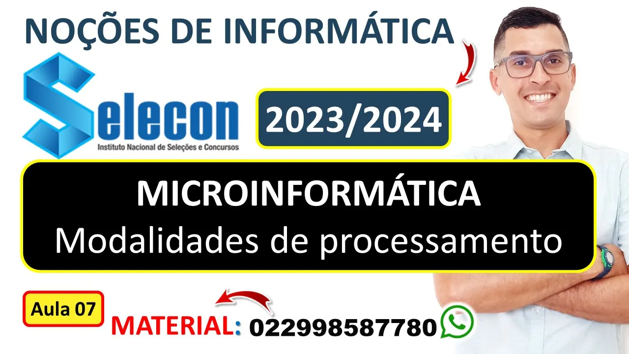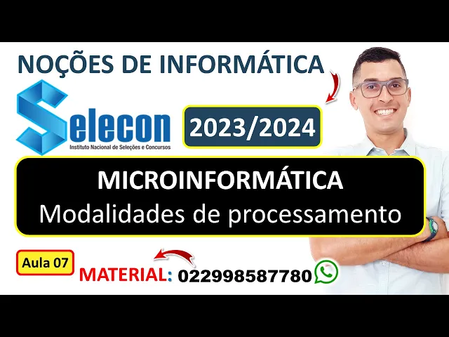 Olá seja bem-vindo ao meu canal de informática para concursos públicos meu nome é romilton Júnior sou professor de informática para concurso e nesse vídeo eu vou dar uma aula gratuita sobre noções de informática com foco na banca selecom nessa sétima aula eu vou falar sobre o micro informática modalidade de processamento que é um assunto muito cobrado pela banca selecon e por outras bancas também se você quiser adquirir meu curso de informática com foco na banca celecon e também provas anteriores da sedecon é só entrar em contato comigo pelo WhatsApp pelo telefone 022 998587780 se você