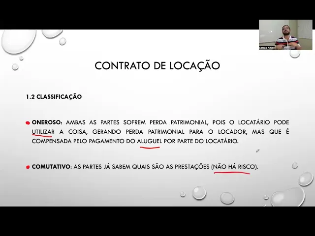 forma periódica conforme avançado entre eles Beleza então o contrato oneroso como tá ativo é um contrato comutativo né Nós não pensamos em risco quando nós falamos em locação para que as partes já sabem Quais são as prestações né o valor do aluguel tá lá estipulado enfim lá se falar em risco as prestações são bem conhecidas pelas partes de antena trata-se de um contrato consensual como eu já falei que é a regra o direito contratual brasileiro a locação se aperfeiçoa com a manifestação de vontade das partes tranquilo e alocação é um contrato de Trato sucessivo tu
