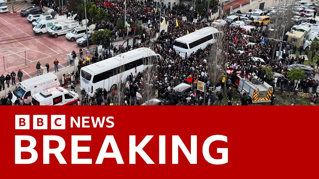 part of the agreement 200 Palestinian prisoners have been released from Israeli jails just seeing from Egypt State linked media there saying 70 of those freed Palestinian prisoners have arrived in Egypt a large number of the others are going to the West Bank and our correspondent John donison is in rala just describe the scenes to us John well you can see the three prison buses behind me about 20 minutes ago those buses arrived and frankly pretty chaotic scenes as the prisoners got off a very large crowd and we saw the prisoners in their gray prison fatigues